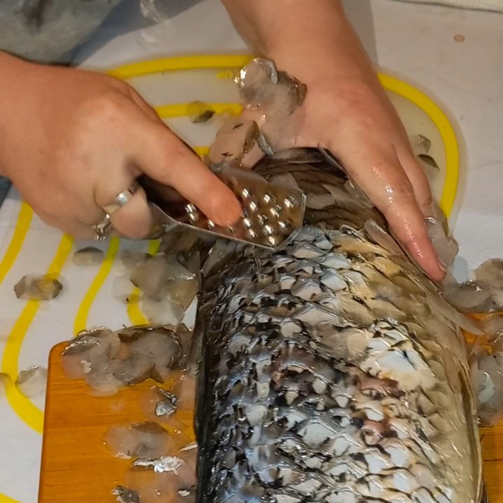 Рыбу не чистить а дерет, чешуя летит во все стороны.