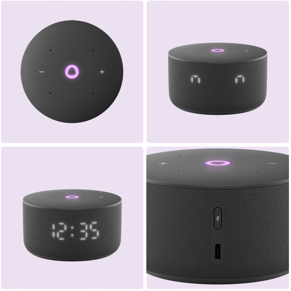 Благодаря более мягкой, цельной и гармоничной форме корпуса Станция Мини 3 отлично смотрится в любом современном интерьере. Цветовая палитра умной колонки тоже обновилась: можно выбрать классические чёрный и серый, а для ценителей акцентов подойдёт пастельный фиолетовый оттенок.
