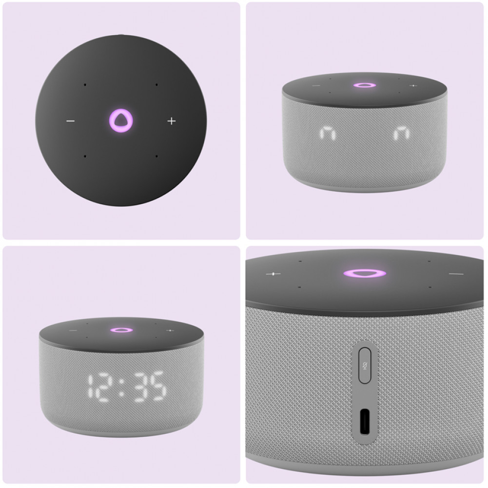 Благодаря более мягкой, цельной и гармоничной форме корпуса Станция Мини 3 отлично смотрится в любом современном интерьере. Цветовая палитра умной колонки тоже обновилась: можно выбрать классические чёрный и серый, а для ценителей акцентов подойдёт пастельный фиолетовый оттенок.