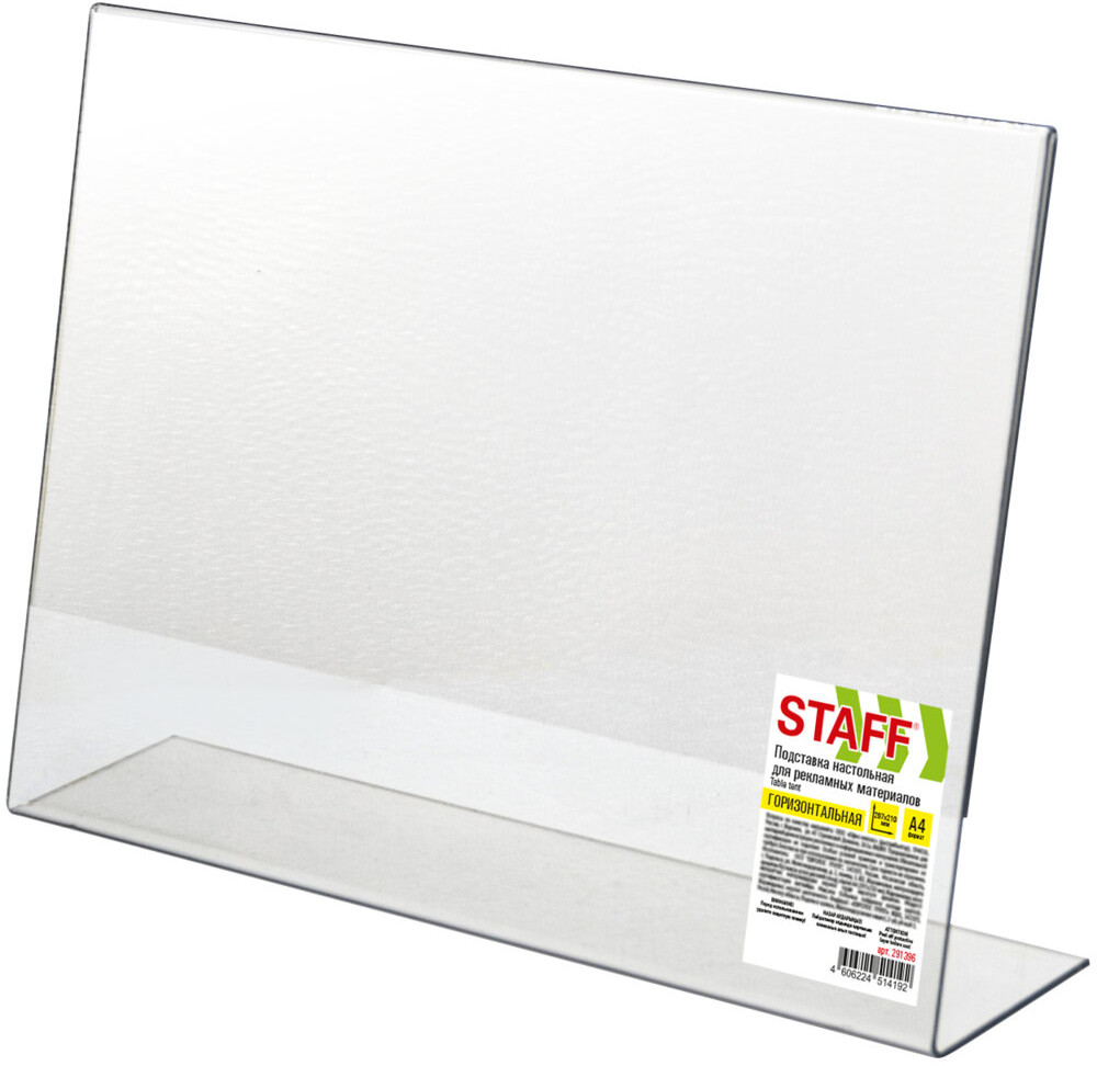 Staff Подставка настольная для рекламных материаловВ данный момент этот товар отсутствует в продаже. Возможно, у нас найдется аналогичный или похожий товар здесь. Односторонняя горизонтальная настольная подставка Staff подходит для размещения меню, рекламных материалов формата А4. Изготовлена из прочного прозрачного ПЭТ. Предназначена для настольного размещения. Формат — А4 и меньше. Максимальная высота вставляемого листа — 210 мм, максимальная ширина вставляемого листа — 297 мм. |