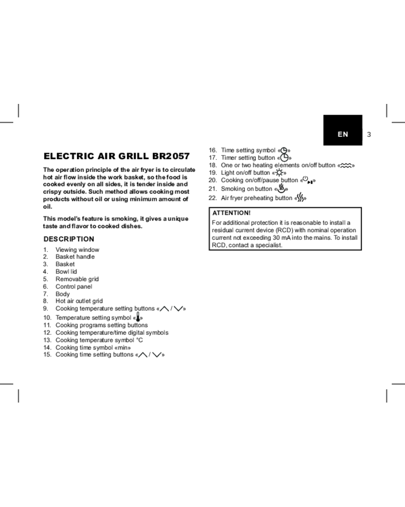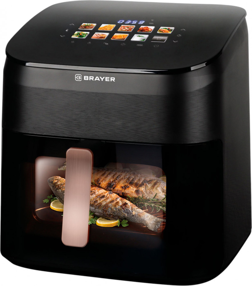 Аэрогриль Brayer BR2057 — универсальный кухонный помощник для тех, кто любит вкусную и разнообразную еду без лишних хлопот. Благодаря двум ТЭНам блюдо равномерно прогревается с двух сторон, получая аппетитную корочку и сочную текстуру внутри. Большой объём позволяет готовить блюда для всей семьи, а функция использования древесной щепы придаёт еде насыщенный аромат костра. Сенсорное управление и LED-дисплей делают использование простым и интуитивным, а широкий диапазон температур подходит как для быстрой жарки, так и для деликатных процессов — сушки и ферментации. Предустановленные программы помогут легко приготовить мясо, рыбу, овощи, выпечку и многое другое. Съёмная решётка с антипригарным покрытием упрощает уход, а звуковой сигнал сообщит о готовности блюда.