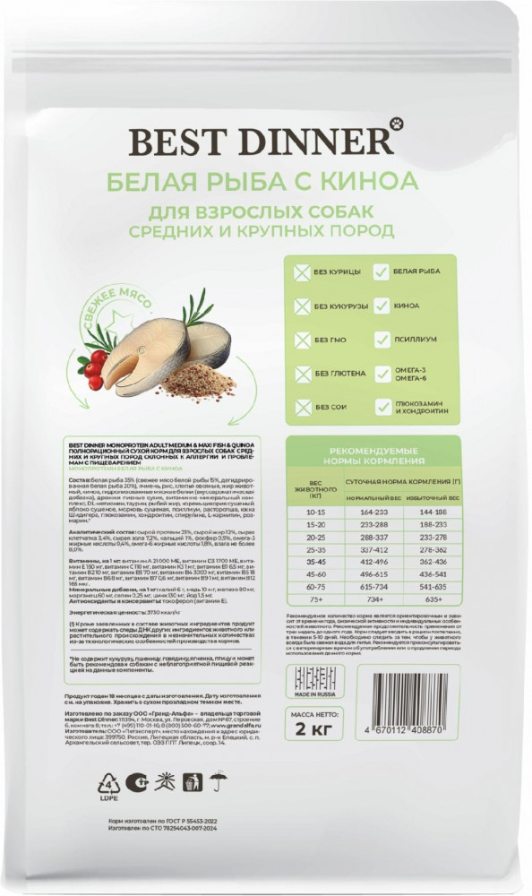 Best Dinner Сухой корм для собак крупных и средних пород «Белая рыба с киноа»