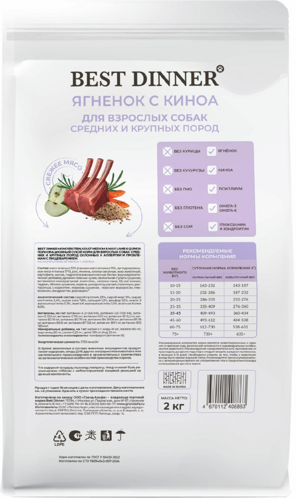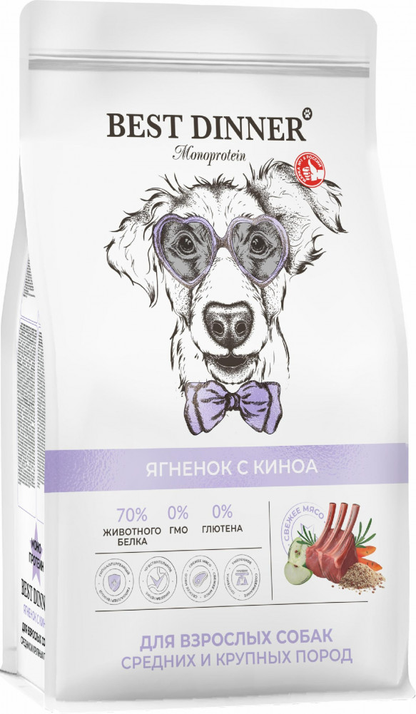 Best Dinner Сухой корм для собак крупных и средних пород «Ягненок и киноа»