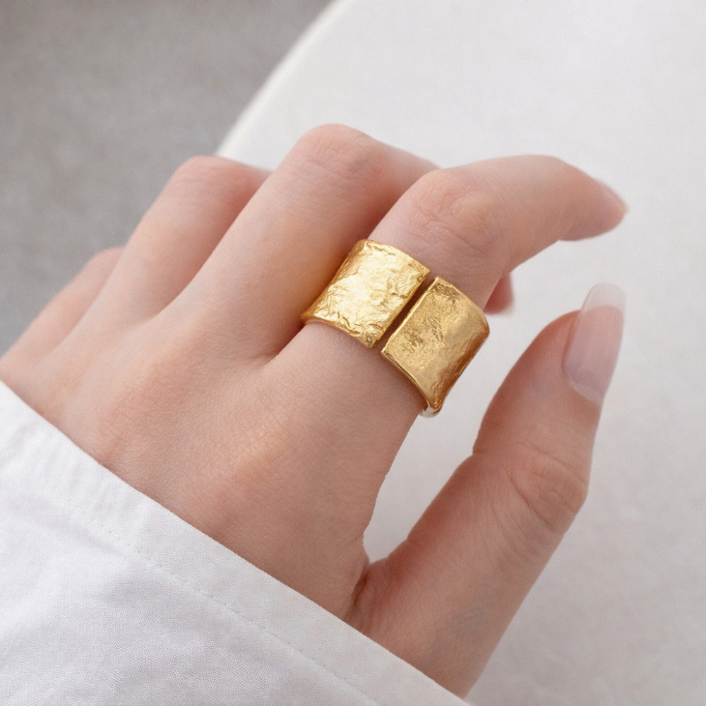 Кольцо женское широкое фактурное, золотистое, регулируемое
