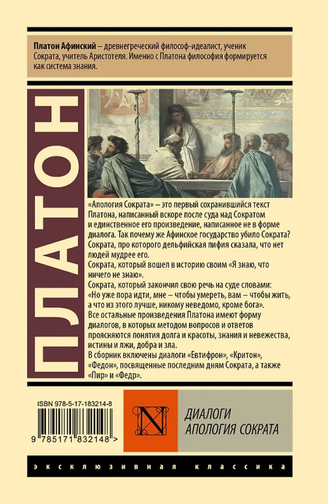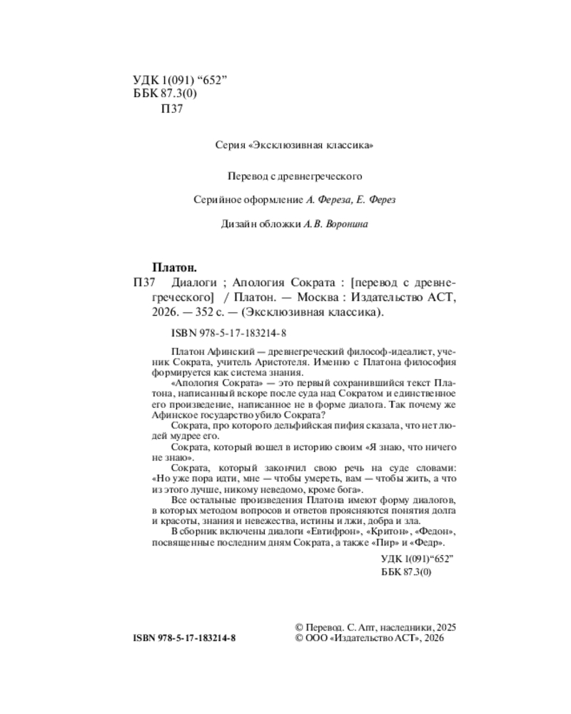 💳 Оплатить за товар можно при получении 🇰🇿 Есть бесплатная доставка по Казахстану от 1 дня 🎁 Копите бонусы с каждой покупки Серия: Эксклюзивная классика. Лучшее Платон Афинский — древнегреческий философ-идеалист, ученик Сократа, учитель Аристотеля. Именно с Платона философия формируется как система знания. «Апология Сократа» — это первый сохранившийся текст Платона, написанный вскоре после суда над Сократом, и единственное его произведение, написанное не в форме диалога. Так почему же Афинское государство убило Сократа? Сократа, про которого дельфийская пифия сказала, что нет людей мудрее его. Сократа, который вошел в историю своим «Я знаю, что ничего не знаю». Сократа, который закончил свою речь на суде словами: «Но уже пора идти, мне — чтобы умереть, вам — чтобы жить, а что из этого лучше, никому не ведомо, кроме бога». |