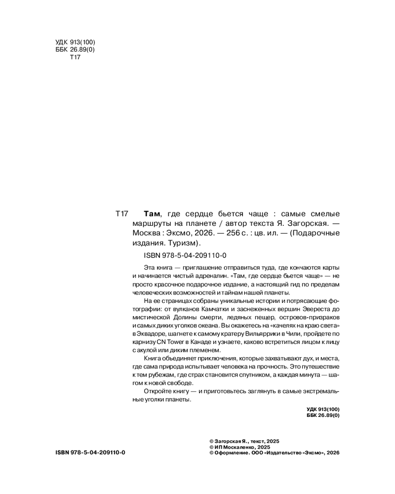 💳 Оплатить за товар можно при получении 🇰🇿 Есть бесплатная доставка по Казахстану от 1 дня 🎁 Копите бонусы с каждой покупки Серия: Подарочные издания. Туризм «Самые экстремальные места на планете» — это книга, которая заставляет сердце биться чаще. Она создана для тех, кто умеет мечтать о невозможном и готов вдохновляться смелостью первооткрывателей. На ее страницах оживают вулканы и ледники, мистические острова и бескрайние пустыни, вершины, где проверяется человеческая воля, и глубины, где природа показывает свой грозный характер. |