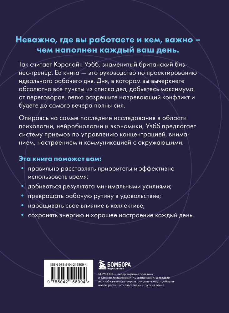💳 Оплатить за товар можно при получении 🇰🇿 Есть бесплатная доставка по Казахстану от 1 дня 🎁 Копите бонусы с каждой покупки Серия: Личная эффективность. Книги, которые помогают сохранять тонус и фокус Не важно, где вы работаете и кем, важно — чем наполнен каждый ваш день. Так считает Кэролайн Уэбб, знаменитый британский бизнес-тренер. Ее книга — это руководство по проектированию идеального рабочего дня. Дня, в котором вы вычеркнете абсолютно все пункты из списка дел, добьётесь максимума от переговоров, легко разрешите назревающий конфликт и будете до самого вечера полны сил. |