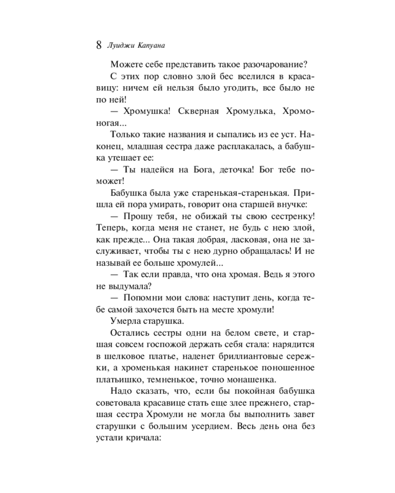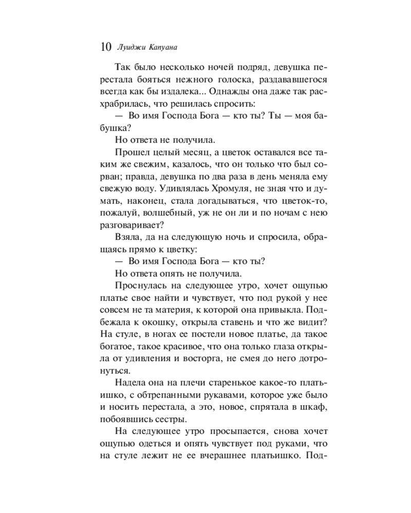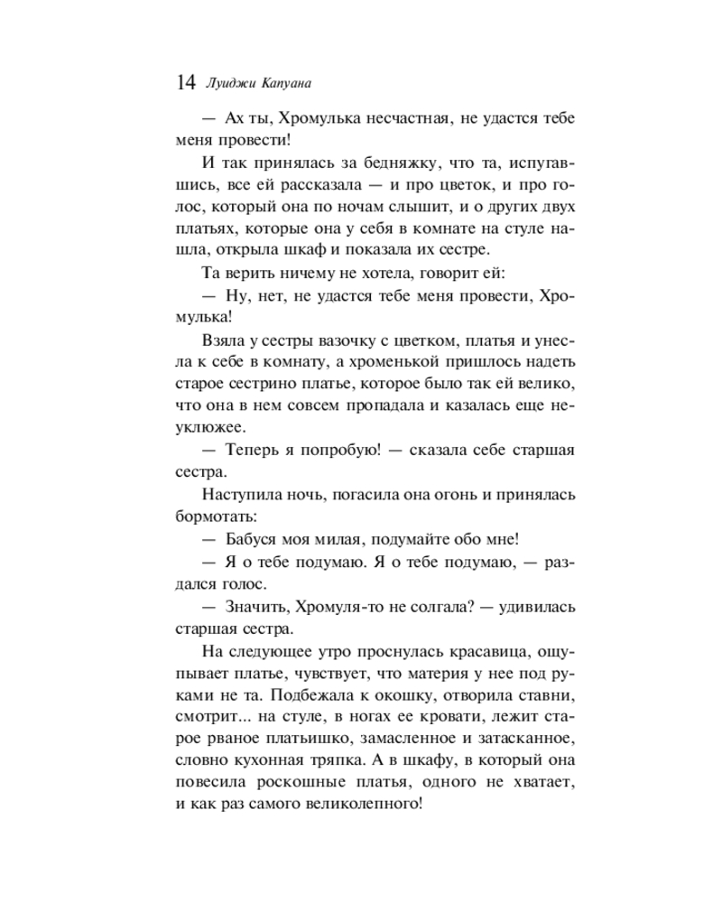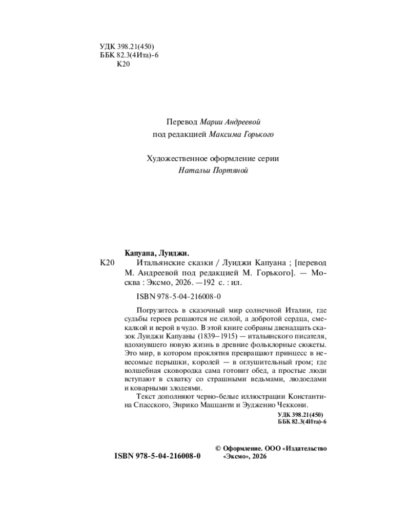💳 Оплатить за товар можно при получении 🇰🇿 Есть бесплатная доставка по Казахстану от 1 дня 🎁 Копите бонусы с каждой покупки Серия: Магистраль. Сказки, мифы, легенды Погрузитесь в сказочный мир солнечной Италии, где судьбы героев решаются не силой, а добротой сердца, смекалкой и верой в чудо. В этой книге собрано двенадцать сказок Луиджи Капуаны (1839–1915) — итальянского писателя, вдохнувшего новую жизнь в древние фольклорные сюжеты. Это мир, в котором проклятия превращают принцесс в невесомые перышки, королей — в оглушительный гром; где волшебная сковородка сама готовит обед, а простые люди вступают в схватку со страшными ведьмами, людоедами и коварными злодеями. Перевод Марии Андреевой под редакцией Максима Горького. Текст дополняют черно-белые иллюстрации Константина Спасского, Энрико Маццанти и Эудженио Чеккони. |