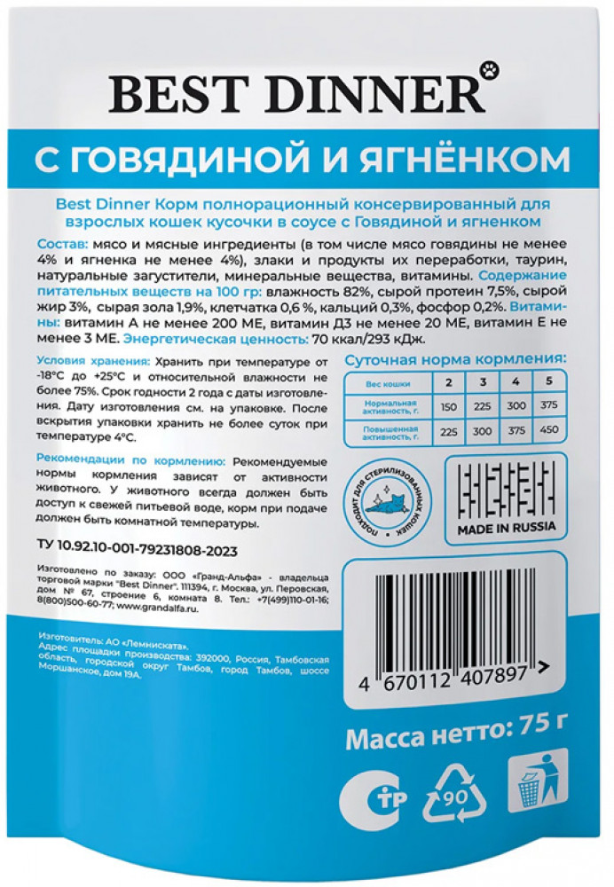 Best Dinner Корм влажный для взрослых кошек с говядиной и ягненком в соусе