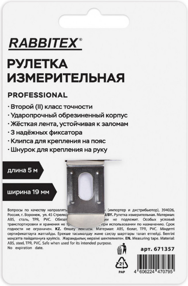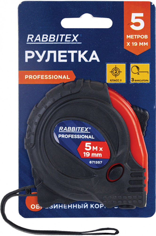Рулетка RABBITEX проста в обращении, обладает повышенной износостойкостью и долгим сроком службы. Корпус рулетки из прочного пластика с прорезиненным покрытием обеспечит защиту инструмента от повреждений при случайном падении. Измерительная лента с метрической шкалой II класса точности изготовлена из прочной углеродистой стали, устойчивой к заломам, и оснащена зацепом для удобства измерений. Рулетка оснащена ремешком для ношения на запястье, а также металлической клипсой для крепления на поясе. Эргономичный дизайн с тремя фиксаторами измерительной ленты позволят использовать рулетку даже одной рукой.