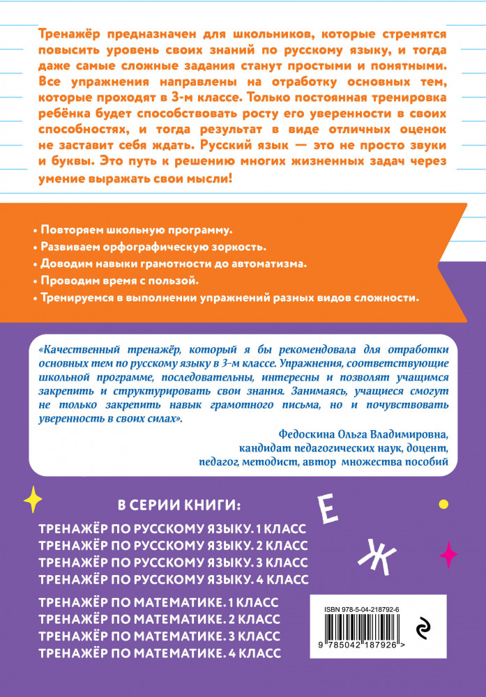 💳 Оплатить за товар можно при получении 🇰🇿 Есть бесплатная доставка по Казахстану от 1 дня 🎁 Копите бонусы с каждой покупки Серия: Тренажер ученика начальных классов Пособие по русскому языку от издательства «Эксмо» подготовлено в соответствии с требованиями ФГОС для начальной школы и может быть использовано с любым из действующих учебников для 3 класса. Удобный тренажер с интересным современным макетом поможет ребенку улучшить грамотность, восполнить пробелы, углубить и систематизировать знания. Занимаясь, школьник не только повторит правописание безударной гласной в корне, приставок и предлогов, безударной гласной в падежных окончаниях, потренируется различать простые и сложные предложения, но и научится работать по плану, то есть выполнять определенный алгоритм действий, который поможет ему осознанно применять правила. Когда навык грамотного письма будет доведен до автоматизма, результат в виде твердых знаний и отличных оценок не заставит себя ждать. |