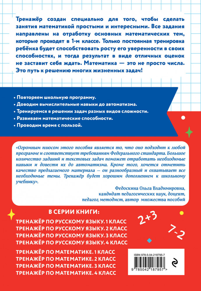 💳 Оплатить за товар можно при получении 🇰🇿 Есть бесплатная доставка по Казахстану от 1 дня 🎁 Копите бонусы с каждой покупки Серия: Тренажер ученика начальных классов Пособие от издательства «Эксмо», соответствующее ФГОС, разработано специалистом с многолетним опытом работы и станет отличным помощником для учеников 1 класса в отработке умений и навыков, полученных на уроках математики. Решение большого количества примеров на сложение и вычитание и задач в одно и два действия в пределах 20 даст возможность школьникам в дальнейшем избежать вычислительных ошибок и довести навыки счёта до автоматизма. Занимаясь по книге, учащиеся смогут повторить такие темы, как «Количество», «Состав числа», «Сравнение»; научатся анализировать информацию и понимать учебную задачу, а также смогут закрепить пройденный материал, восполнить пробелы в знаниях, развить математические способности, повысить успеваемость по предмету. |