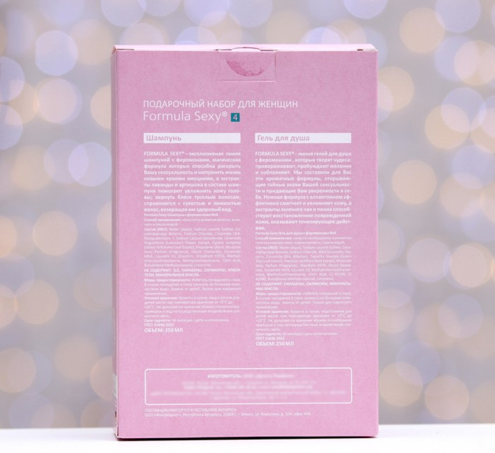 💳 Оплатить за товар можно при получении 🇰🇿 Есть бесплатная доставка по Казахстану от 1 дня 🎁 Копите бонусы с каждой покупки Серия: Formula Sexy Подарочный набор для женщин Formula Sexy — потрясающая от крупнейшего отечественного производителя парфюмерии. Formula Sexy эксклюзивная линия шампуней с феромонами 250 мл, магическая формула которых способна раскрыть Вашу сексуальность и наполнить жизнь новыми яркими эмоциями, а экстракты лаванды и артишока в составе шампуня помогают увлажнить кожу головы; вернуть блеск тусклым волосам; справляются с сухостью и ломкостью волос, возвращая им здоровый вид. Formula Sexy линия гелей для душа с феромонами 250 мл , которые творят чудеса: привораживают, пробуждают желания и соблазняют. Мы составили для Вас эти ароматные формулы, открывающие тайные знаки Вашей сексуальности и придающие Вам уверенности в себе. Нежная формула с аллантоином эффективно смягчает и увлажняет кожу, а экстракты зеленого чая и пиона способствуют восстановлению поврежденной кожи, оказывают тонизирующее действие. |