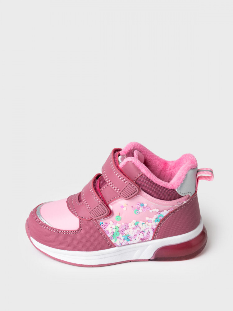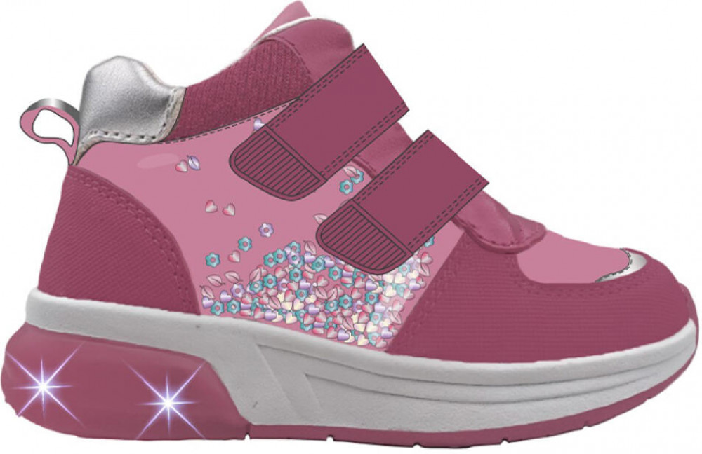Стильные ботинки для девочки с огоньками. Кроссовки выполнены из искусственной кожи, обладающей высокими эксплуатационными свойствами. Сбоку ботинки имеют большой прозрачный патч с цветными сердечками, которые при ходьбе пересыпаются по всей поверхности детали. Носочная и пяточная часть выполнена из специального защитного материала. Модель имеет светоотражающие элементы. В обуви стоит текстильная подкладка c высоким содержанием хлопка 80%, которая обладает высокой гигроскопичностью. Две липучки очень удобны для детей при обувании. Флисовая стелька вынимается для просушки. Формоустойчивый задник поддерживает стопу в правильном положении. Эргономичная форма колодки обеспечивает правильное формирование стопы ребенка. Подошва из ТПР не скользит и устойчива к истиранию. Подошва с мигающим элементом flashlight.
