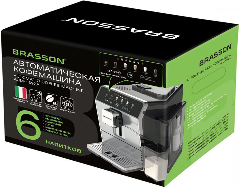💳 Оплатить за товар можно при получении 🇰🇿 Есть бесплатная доставка по Казахстану от 1 дня 🎁 Копите бонусы с каждой покупки Кофемашина Brasson ACM-1592A превращает процесс приготовления идеального напитка в простое и приятное занятие. Представьте себе профессиональную кофейню прямо у вас дома, где каждое утро начинается с чашки свежесваренного кофе. С помощью нашей кофемашины вы можете приготовить 6 напитков: эспрессо, американо, латте, капучино, молочную пену и горячую воду. Три степени крепости напитков создают возможность настроить напиток под индивидуальные предпочтения. |