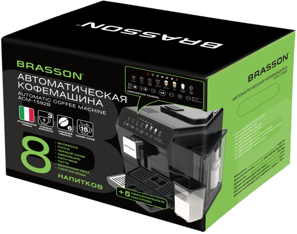 💳 Оплатить за товар можно при получении 🇰🇿 Есть бесплатная доставка по Казахстану от 1 дня 🎁 Копите бонусы с каждой покупки Кофемашина Brasson ACM-1592B превращает процесс приготовления идеального напитка в простое и приятное занятие. Представьте себе профессиональную кофейню прямо у вас дома, где каждое утро начинается с чашки свежесваренного кофе. С помощью нашей кофемашины вы можете приготовить 8 напитков: эспрессо, американо, латте, капучино, лунго, черный кофе, молочную пену и горячую воду. Также вы можете сохранить 5 персональных напитков в зависимости от сохраненных настроек. |