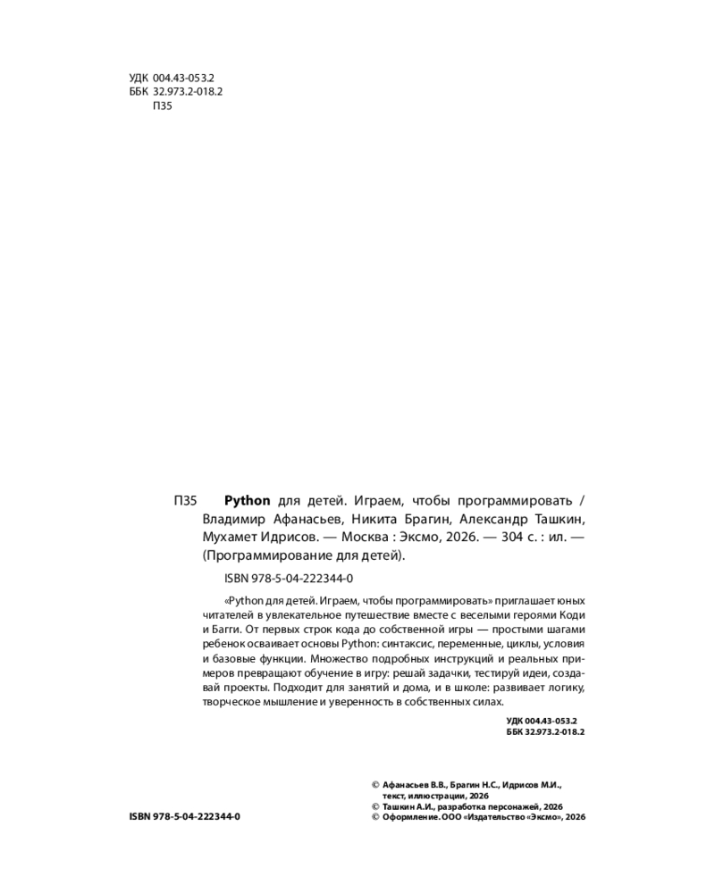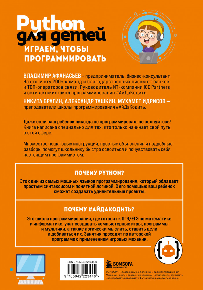 💳 Оплатить за товар можно при получении 🇰🇿 Есть бесплатная доставка по Казахстану от 1 дня 🎁 Копите бонусы с каждой покупки Серия: Программирование для детей Даже если ваш ребенок никогда не программировал, не волнуйтесь! Книга написана специально для тех, кто только начинает свой путь в этой сфере. Множество пошаговых инструкций, простые объяснения и подробные разборы помогут школьнику быстро освоиться и почувствовать себя настоящим программистом. |
