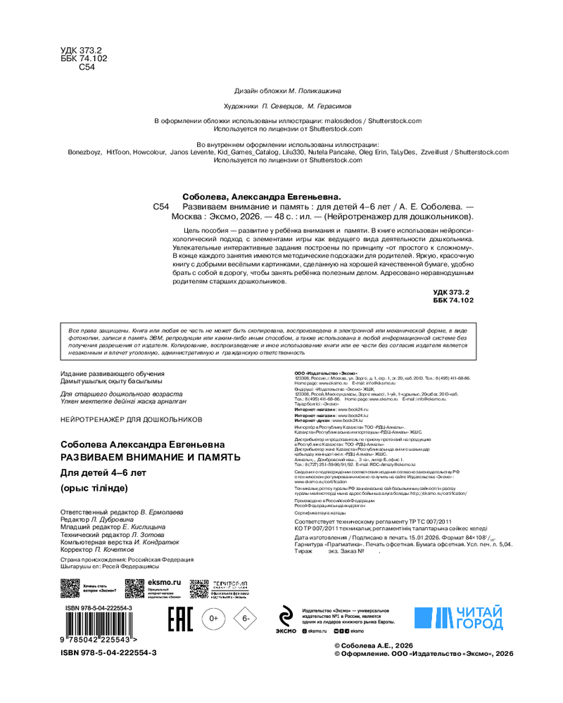 💳 Оплатить за товар можно при получении 🇰🇿 Есть бесплатная доставка по Казахстану от 1 дня 🎁 Копите бонусы с каждой покупки Серия: Нейротренажер для дошкольников Тренажер от издательства «Эксмо» создан практикующим нейропсихологом, который каждый день помогает детям справиться с проблемами, и станет отличным помощником родителям при подготовке ребенка к школе. Пособие, соответствующее ФГОС, будет способствовать развитию у детей внимания, памяти, мелкой моторики, а также станет своевременной профилактикой дисграфии и дислексии. В книге использован нейропсихологический подход с элементами игры как ведущего вида деятельности дошкольника. Выполняя увлекательные задания, ребенок научится концентрировать внимание на конкретном задании, потренирует память, станет более аккуратным и усидчивым. Педагогические подсказки для родителей изложены в блоке «Советы родителям». Книга будет полезна девочкам и мальчикам 4, 5, 6 лет для занятий дома или в детском саду. Эти красочные развивашки с занимательными рисунками можно брать собой в отпуск, чтобы разнообразить досуг полезными занятиями. |