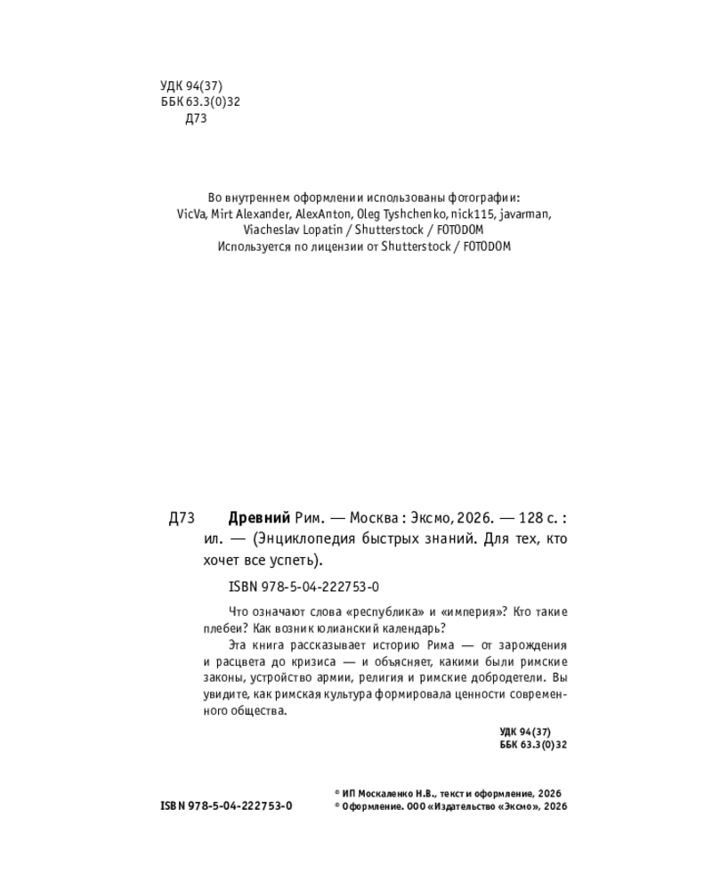 💳 Оплатить за товар можно при получении 🇰🇿 Есть бесплатная доставка по Казахстану от 1 дня 🎁 Копите бонусы с каждой покупки Серия: Энциклопедия быстрых знаний (обложка) Римская империя — самая известная и величественная из европейских цивилизаций, и даже само слово «империя» уходит корнями в римское прошлое. Наследие Рима во многом сформировало наше мышление, язык и культуру, его след заметен во всём: от государственных институтов и инженерных решений до искусства и литературы. Эта книга поможет понять, как римская культура повлияла на современное общество и ценности. Вы проследите историю «Вечного города» от зарождения и расцвета до кризиса, прочитаете о войнах и мятежах, законах и религии, разберетесь, в чём смысл римских добродетелей и римского образа жизни. |