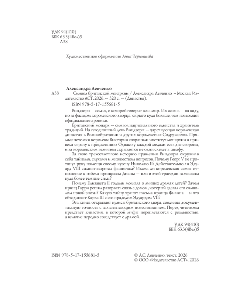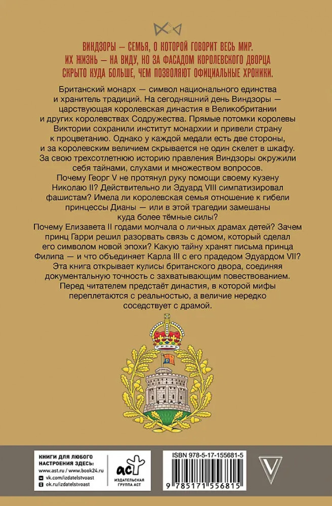 💳 Оплатить за товар можно при получении 🇰🇿 Есть бесплатная доставка по Казахстану от 1 дня 🎁 Копите бонусы с каждой покупки Серия: Династия Виндзоры — семья, о которой говорит весь мир. Их жизнь — на виду, но за фасадом королевского дворца скрыто куда больше, чем позволяют официальные хроники. Британский монарх — символ национального единства и хранитель традиций. На сегодняшний день Виндзоры — царствующая королевская династия в Великобритании и других королевствах Содружества. Прямые потомки королевы Виктории сохранили институт монархии и привели страну к процветанию. Однако у каждой медали есть две стороны, и за королевским величием скрывается не один скелет в шкафу. За свою трехсотлетнюю историю правления Виндзоры окружили себя тайнами, слухами и множеством вопросов. |