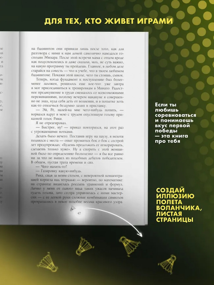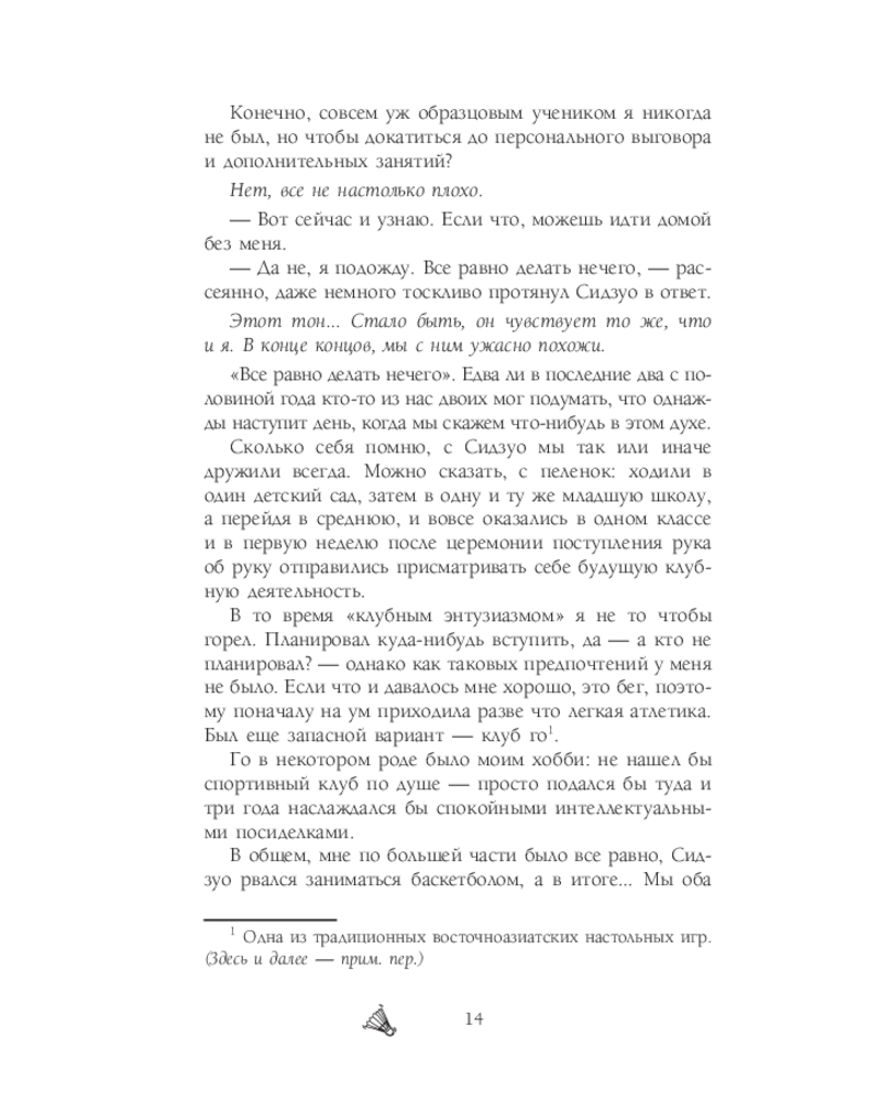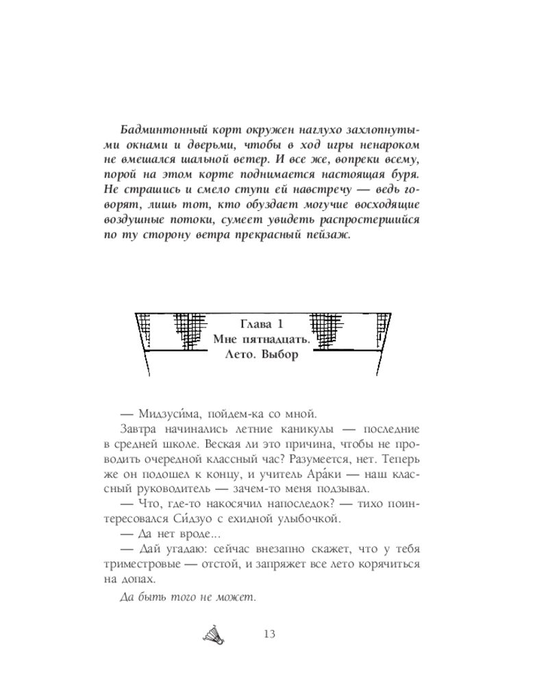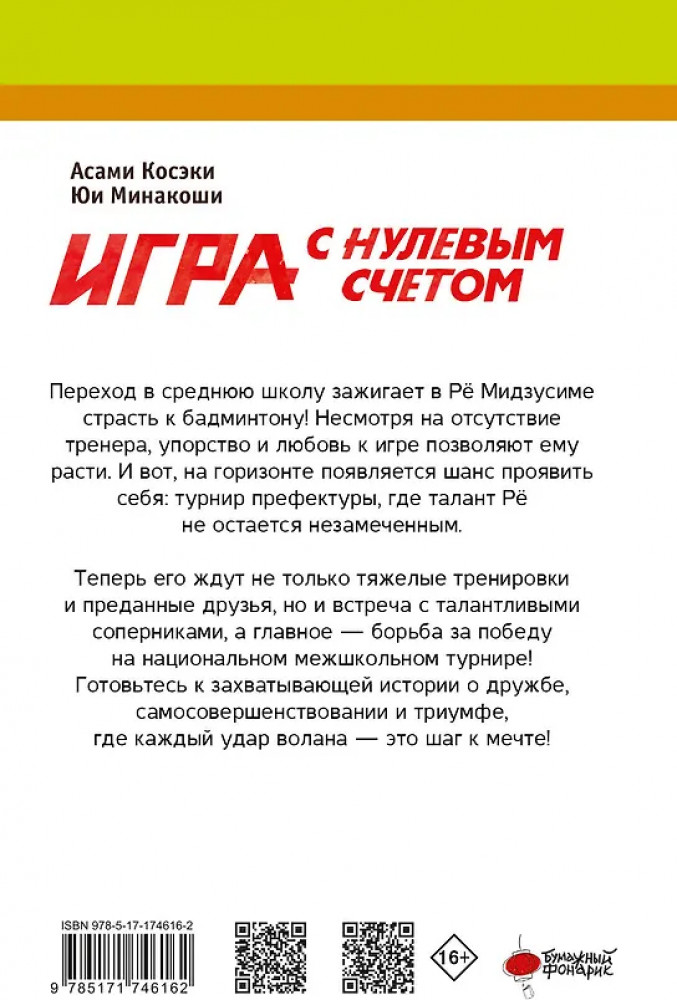 💳 Оплатить за товар можно при получении 🇰🇿 Есть бесплатная доставка по Казахстану от 1 дня 🎁 Копите бонусы с каждой покупки Серия: Новелла. Игра с нулевым счетом Переход в среднюю школу зажигает в Рё Мидзусиме страсть к бадминтону! Несмотря на отсутствие тренера, упорство и любовь к игре позволяют ему расти. И вот на горизонте появляется шанс проявить себя: турнир префектуры, где талант Рё не остается незамеченным. Теперь его ждут не только тяжелые тренировки и преданные друзья, но и встреча с талантливыми соперниками, а главное — борьба за победу на национальном межшкольном турнире! Готовьтесь к захватывающей истории о дружбе, самосовершенствовании и триумфе, где каждый удар ракетки — это шаг к мечте! |
