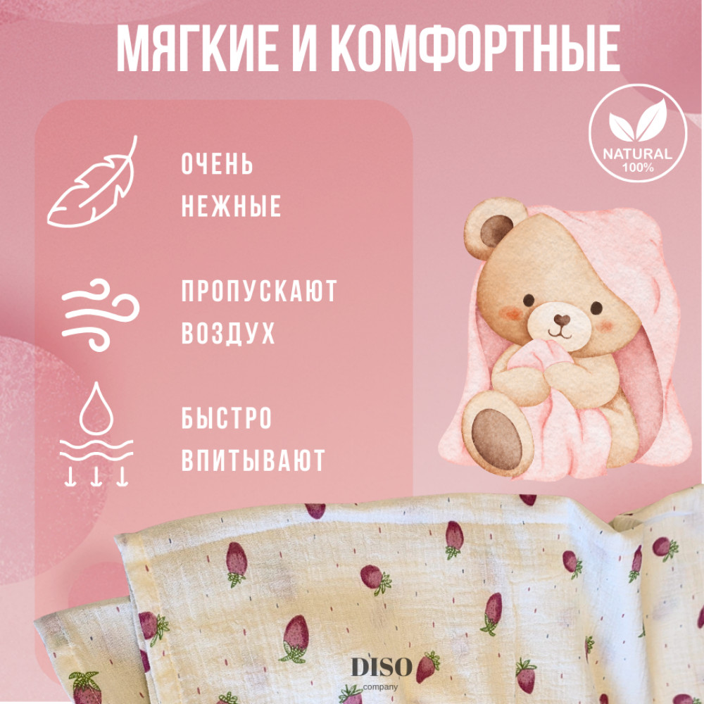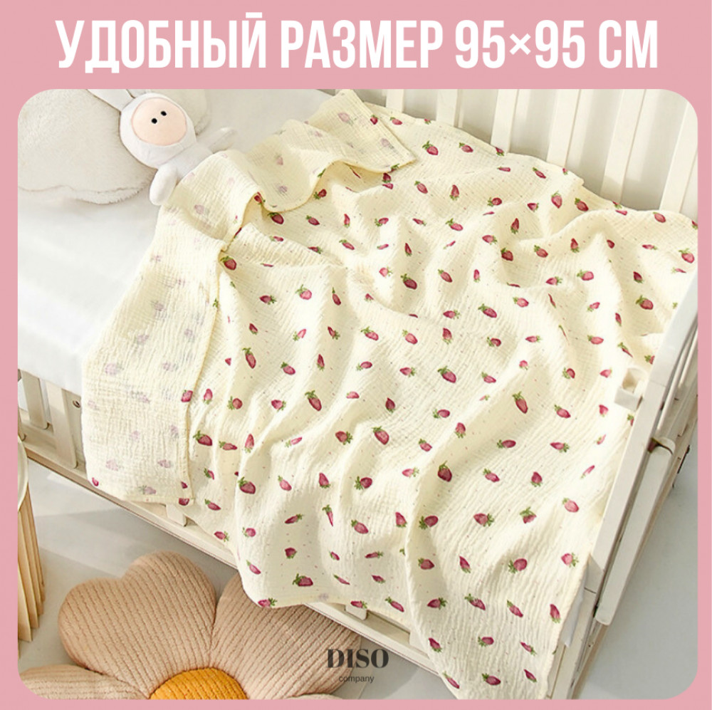 • оптимальный размер 95×95 см — удобно для пеленания, в качестве лёгкого одеяльца, простынки в коляску или кроватку, после купания и в поездках;
