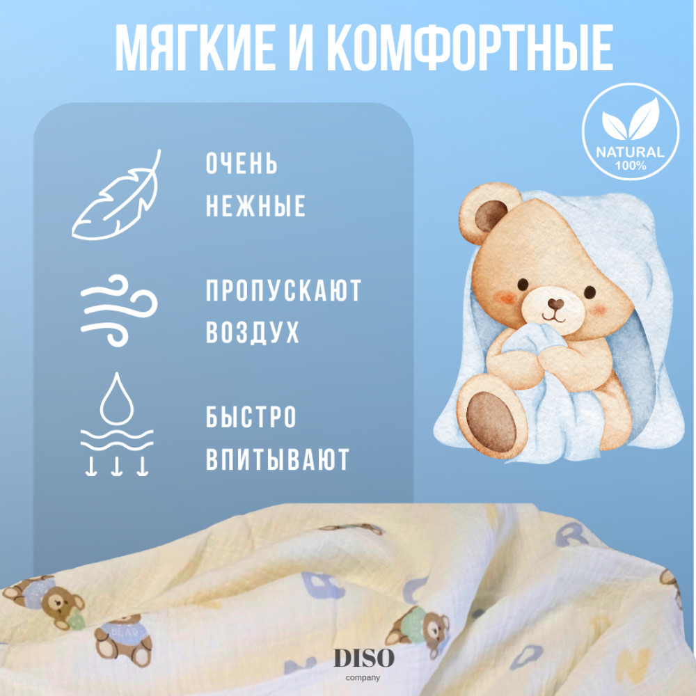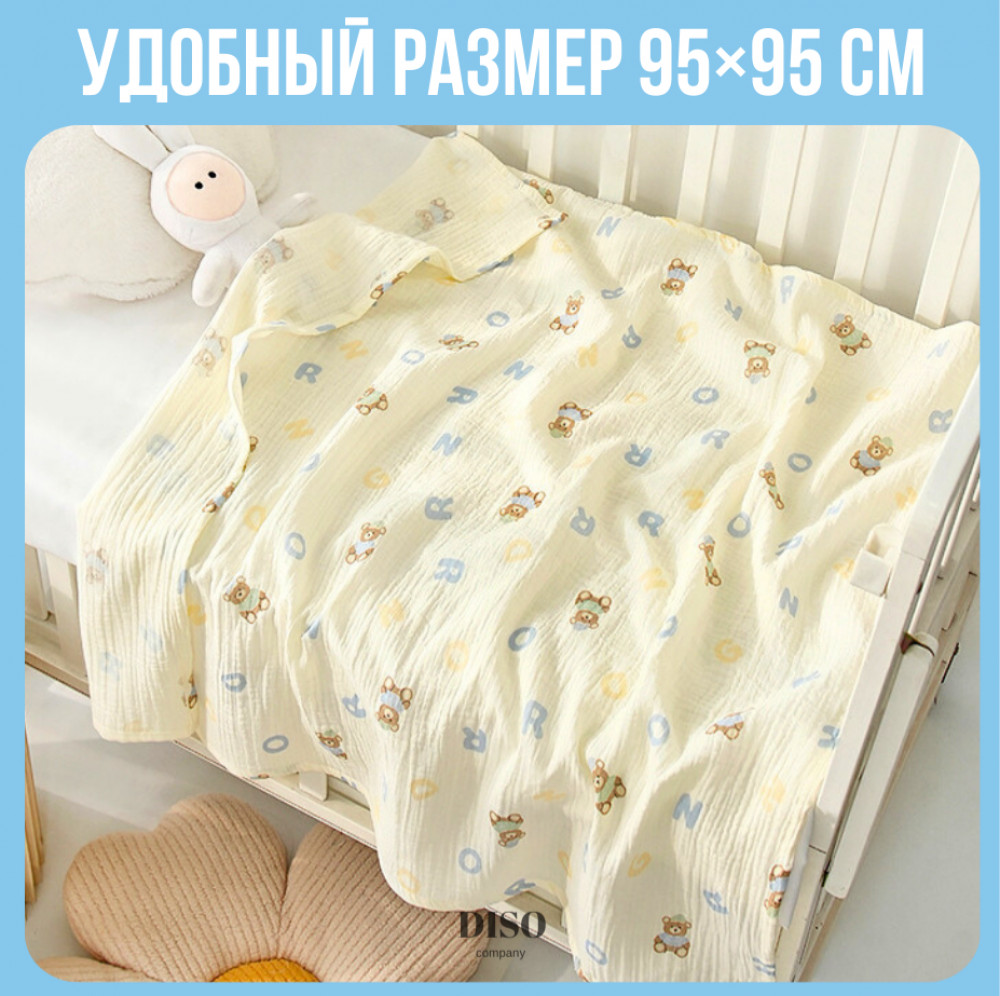 • оптимальный размер 95×95 см — удобно для пеленания, в качестве лёгкого одеяльца, простынки в коляску или кроватку, после купания и в поездках;