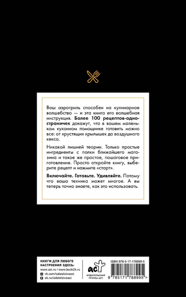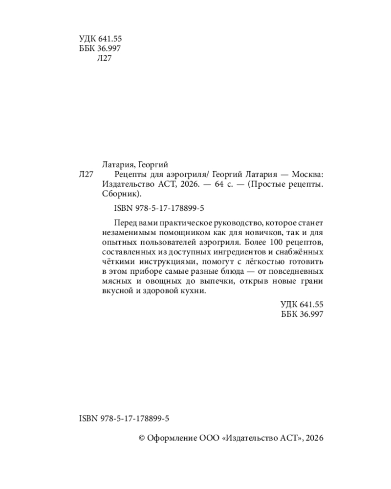 💳 Оплатить за товар можно при получении 🇰🇿 Есть бесплатная доставка по Казахстану от 1 дня 🎁 Копите бонусы с каждой покупки Серия: Простые рецепты. Сборник Перед вами практическое руководство, которое станет незаменимым помощником как для новичков, так и для опытных пользователей аэрогриля. Более 80 рецептов, составленных из доступных ингредиентов и снабжённых чёткими инструкциями, помогут с лёгкостью готовить в этом приборе самые разные блюда — от повседневных мясных и овощных до выпечки, открыв новые грани вкусной и здоровой кухни. |