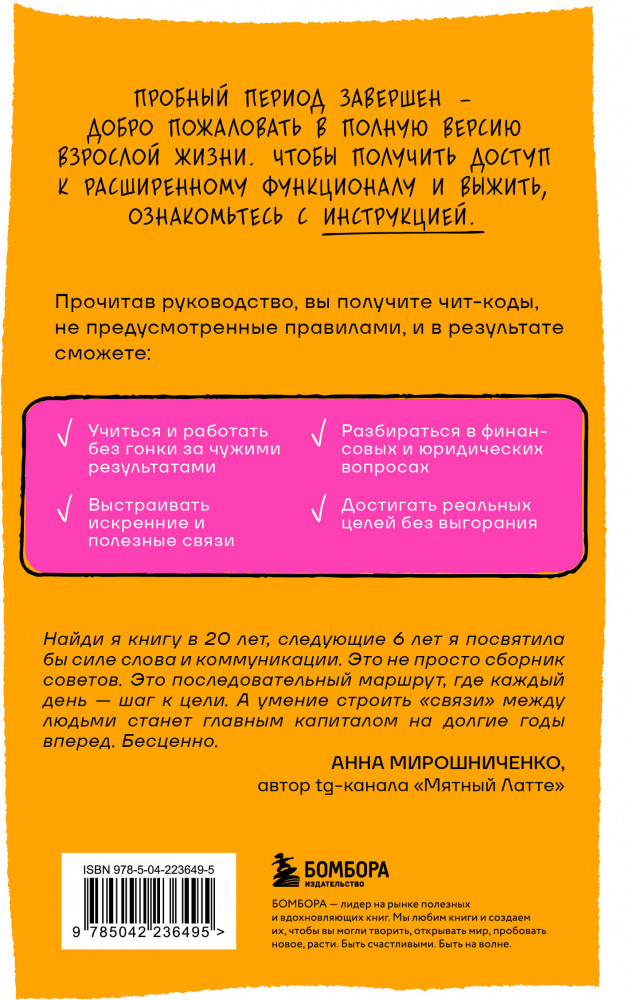 💳 Оплатить за товар можно при получении 🇰🇿 Есть бесплатная доставка по Казахстану от 1 дня 🎁 Копите бонусы с каждой покупки Серия: Книги, которые нужно прочитать до 35 лет Пробный период завершен — добро пожаловать в полную версию взрослой жизни. Чтобы получить доступ к расширенному функционалу и выжить, ознакомьтесь с инструкцией. |