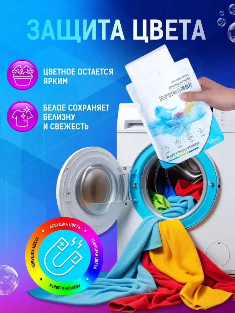 💳 Оплатить за товар можно при получении 🇰🇿 Есть бесплатная доставка по Казахстану от 1 дня 🎁 Копите бонусы с каждой покупки Больше не нужно стирать цветное белье отдельно от белого — салфетки для стирки с функцией защиты от окрашивания предотвращают перенос красителей между тканями. Ловушка для цвета размером 11×14 см абсорбирует цветные частицы: просто добавьте салфетку в барабан вместе с бельем — и белые вещи останутся белоснежными, а цветные сохранят насыщенность оттенков. Салфетки помогают экономить время, воду и моющие средства, позволяя стирать всё вместе — особенно удобно для детской одежды. Подходят для всех типов тканей, включая деликатные, пуховые изделия, спортивную, джинсовую и верхнюю одежду, а также постельное белье; не повреждают волокна. Инновационная технология быстрого поглощения цвета работает как уловитель и блокатор красителя, дополнительно собирая шерсть и пыль с вещей. В упаковке 50 салфеток — хватит на 25–50 стирок. |
