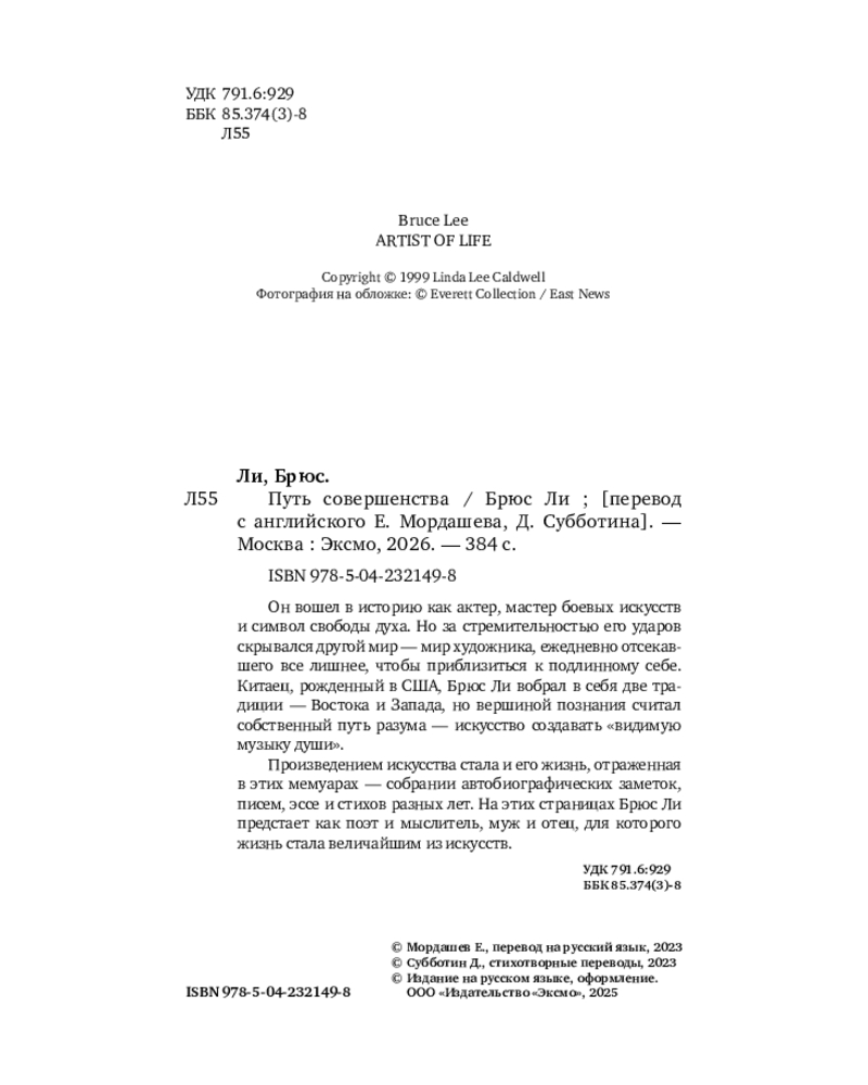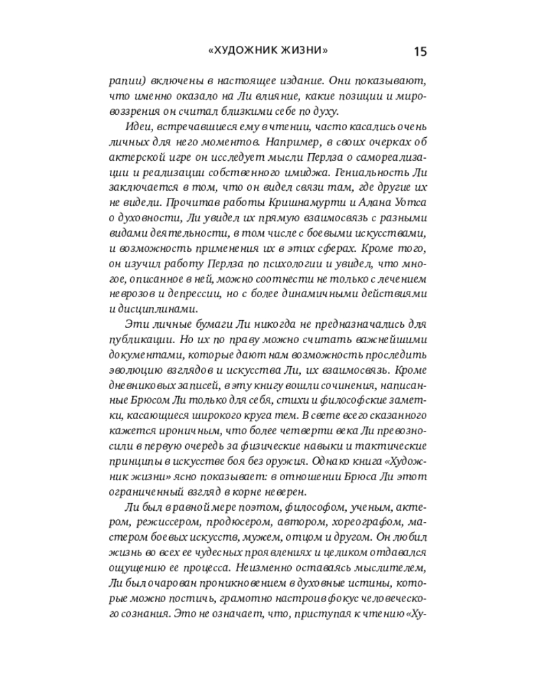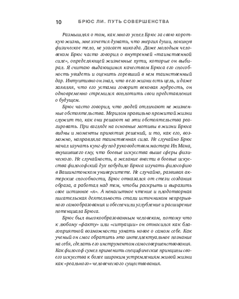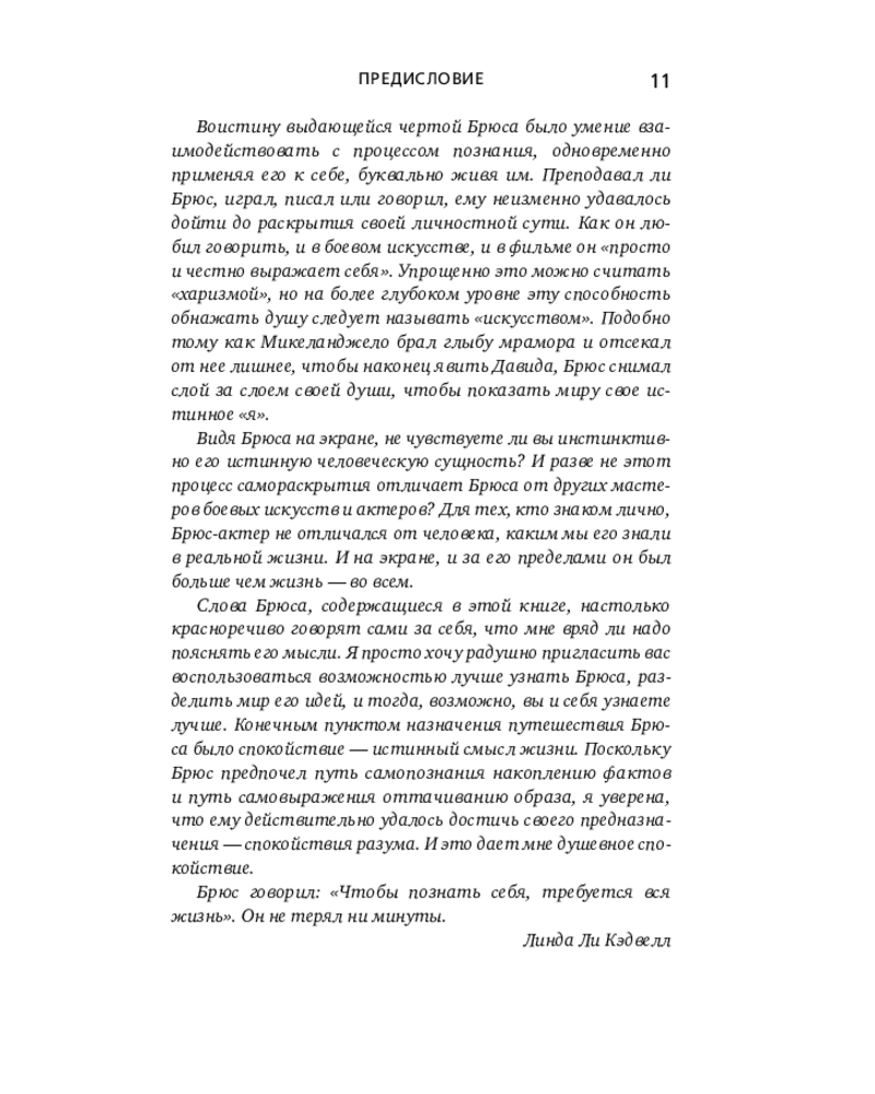 💳 Оплатить за товар можно при получении 🇰🇿 Есть бесплатная доставка по Казахстану от 1 дня 🎁 Копите бонусы с каждой покупки Серия: Автобиография великого человека Уникальная философия мысли и жизни — от легендарного Брюса Ли. Он вошел в историю как актер, мастер боевых искусств и символ свободы духа. Но за стремительностью его ударов скрывался другой мир — мир художника, который ежедневно отсекал всё лишнее, чтобы приблизиться к подлинному себе. Китаец, рожденный в США, Брюс Ли вобрал в себя две традиции — Востока и Запада. Он обращался к мудрецам Индии и Китая, к античным и современным философам, но вершиной познания считал собственный путь разума — искусство создавать «видимую музыку души». |