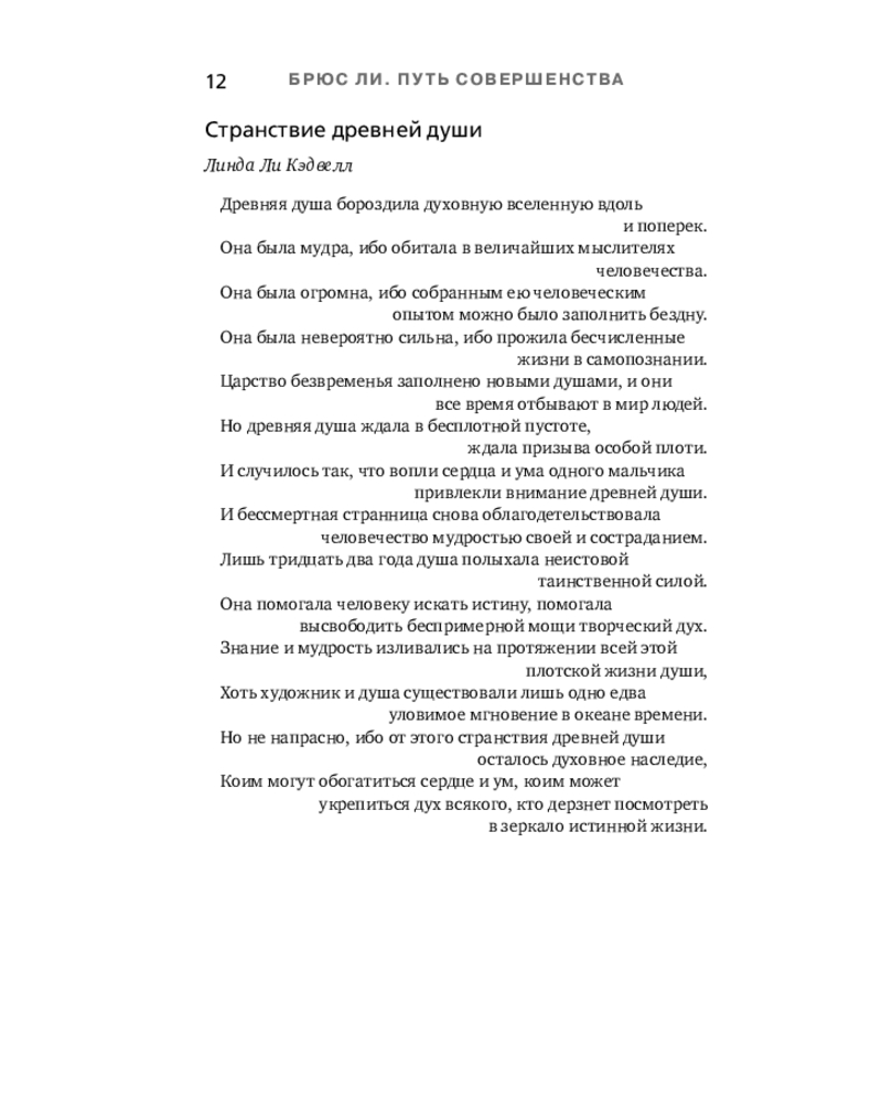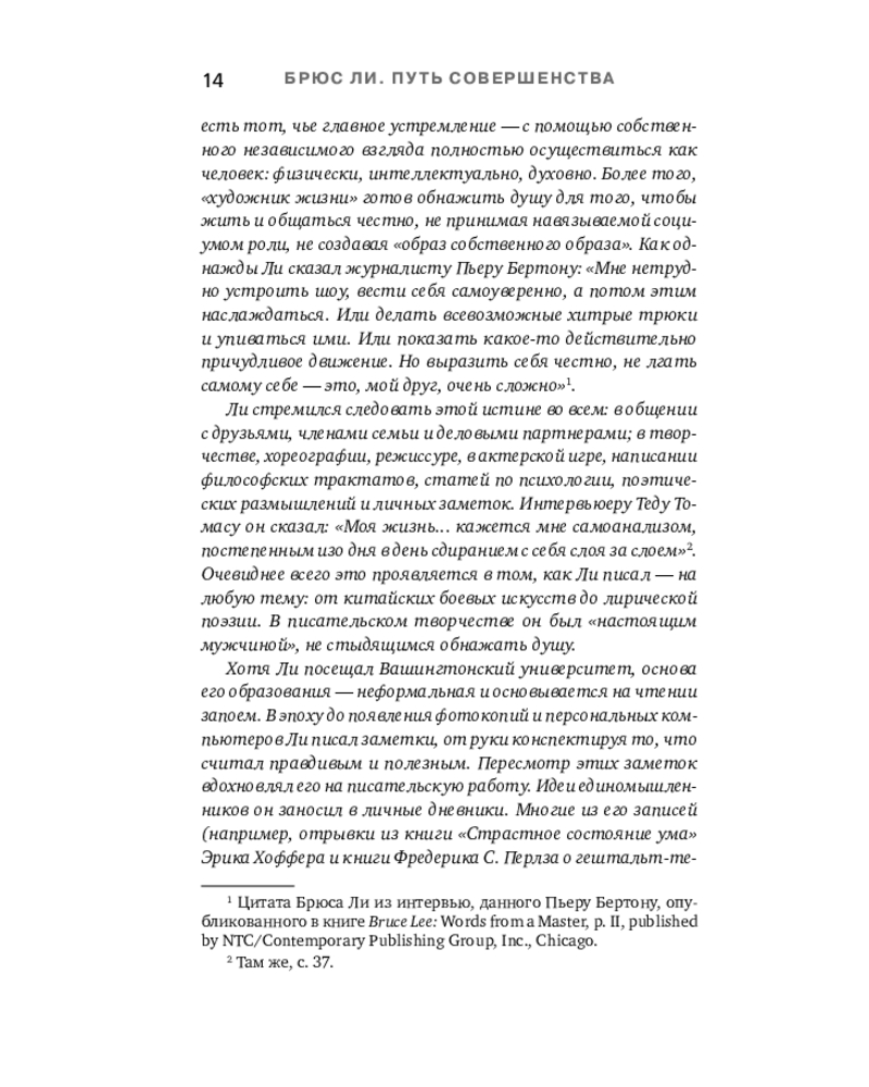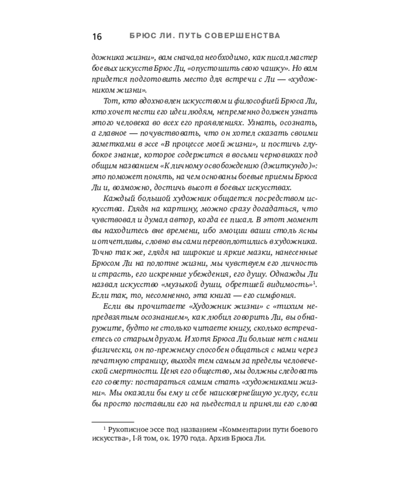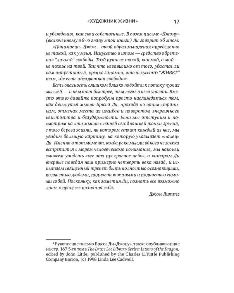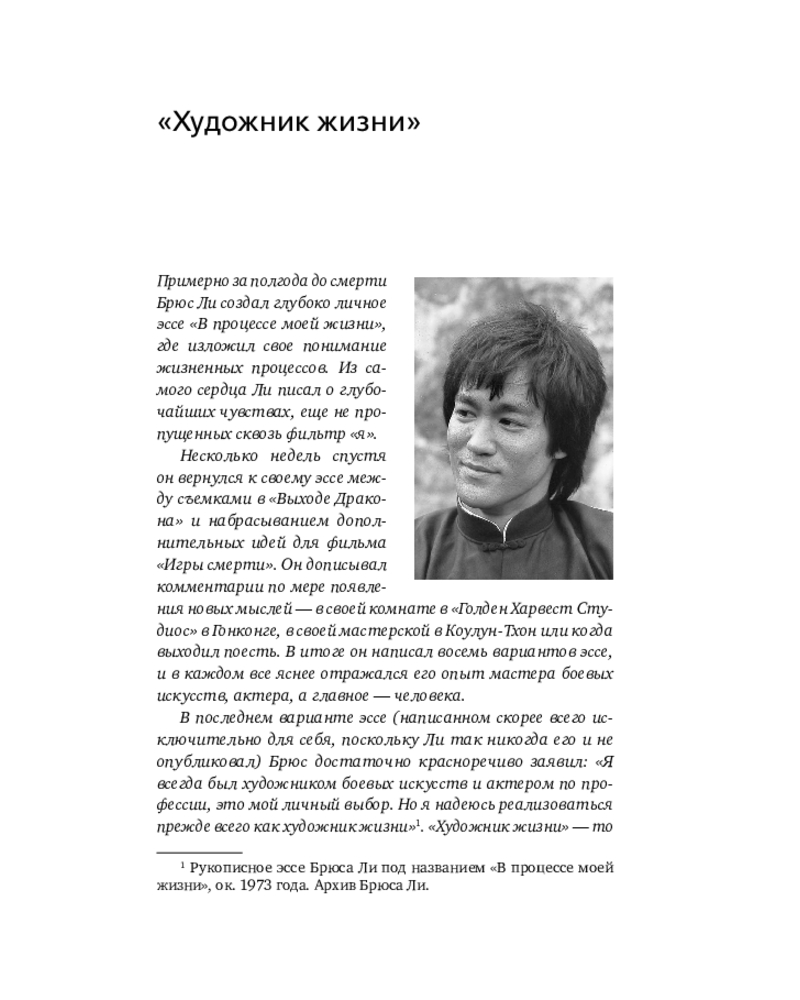 💳 Оплатить за товар можно при получении 🇰🇿 Есть бесплатная доставка по Казахстану от 1 дня 🎁 Копите бонусы с каждой покупки Серия: Автобиография великого человека Уникальная философия мысли и жизни — от легендарного Брюса Ли. Он вошел в историю как актер, мастер боевых искусств и символ свободы духа. Но за стремительностью его ударов скрывался другой мир — мир художника, который ежедневно отсекал всё лишнее, чтобы приблизиться к подлинному себе. Китаец, рожденный в США, Брюс Ли вобрал в себя две традиции — Востока и Запада. Он обращался к мудрецам Индии и Китая, к античным и современным философам, но вершиной познания считал собственный путь разума — искусство создавать «видимую музыку души». |