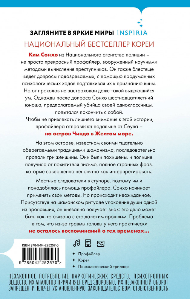 💳 Оплатить за товар можно при получении 🇰🇿 Есть бесплатная доставка по Казахстану от 1 дня 🎁 Копите бонусы с каждой покупки Серия: Tok. Иямису-триллер о профайлерах и маньяках Ким Сонхо из Национального агентства полиции — не просто прекрасный профайлер, вооруженный научными методами вычисления преступников. Он также блестяще ведет допросы подозреваемых, с помощью продуманных психологических ходов подталкивая их к признанию вины. Но от проколов не застрахован даже такой выдающийся ум. Однажды после допроса Сонхо шестнадцатилетний юноша, предполагаемый убийца своей одноклассницы, попытался покончить с собой. Чтобы не привлекать лишнего внимания к этой истории, профайлера отправляют подальше от Сеула — на остров Чиндо в Желтом море. |