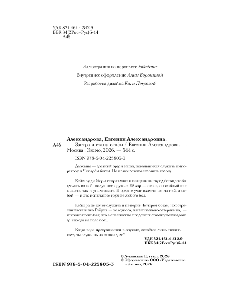 💳 Оплатить за товар можно при получении 🇰🇿 Есть бесплатная доставка по Казахстану от 1 дня 🎁 Копите бонусы с каждой покупки Серия: Охотники за мирами Дарханы — древний орден магов, поклявшихся служить императору и Четырём богам. Но не все готовы склонить голову. Кейсару ди Мори отправляют в священный город богов, чтобы сделать из неё послушное оружие. Её дар — огонь, способный как спасать, так и уничтожать. В ордене учат владеть не магией, а собой — и это испытание труднее любого боя. |