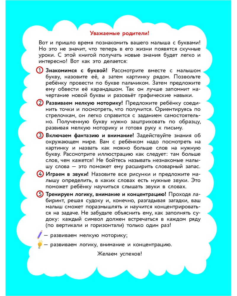 💳 Оплатить за товар можно при получении 🇰🇿 Есть бесплатная доставка по Казахстану от 1 дня 🎁 Копите бонусы с каждой покупки Серия: За пять шагов до школы Современная школа предъявляет очень высокие требования к детям, которые поступают в 1 класс, поэтому дошкольная подготовка является важнейшим этапом для успешного старта. Эта развивашка, предназначенная для детей 5, 6, 7 лет, познакомит ребенка с буквами. Тетрадь содержит более 200 увлекательных заданий. Каждая страница тренажера предлагает множество интересных и разнообразных упражнений, которые помогут не только узнать и научиться писать буквы, но и определять звуки в словах. |