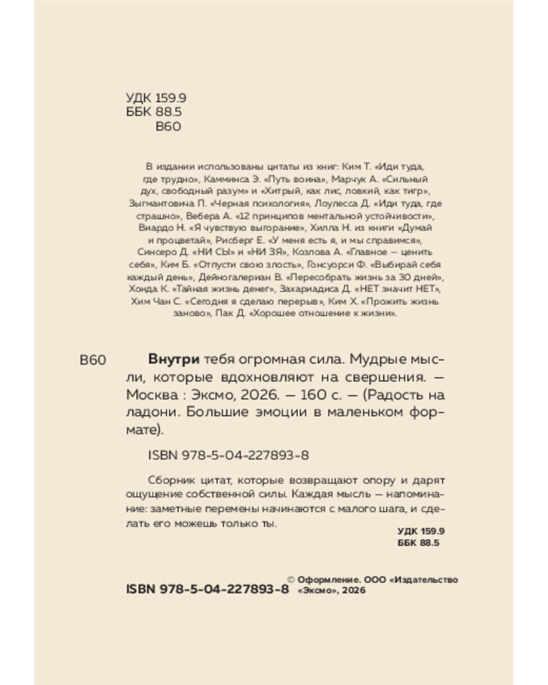 💳 Оплатить за товар можно при получении 🇰🇿 Есть бесплатная доставка по Казахстану от 1 дня 🎁 Копите бонусы с каждой покупки Серия: Радость на ладони. Большие эмоции в маленьком формате Сборник цитат, которые возвращают опору и дарят ощущение собственной силы. Каждая мысль — напоминание: заметные перемены начинаются с малого шага, и сделать его можешь только ты. |
