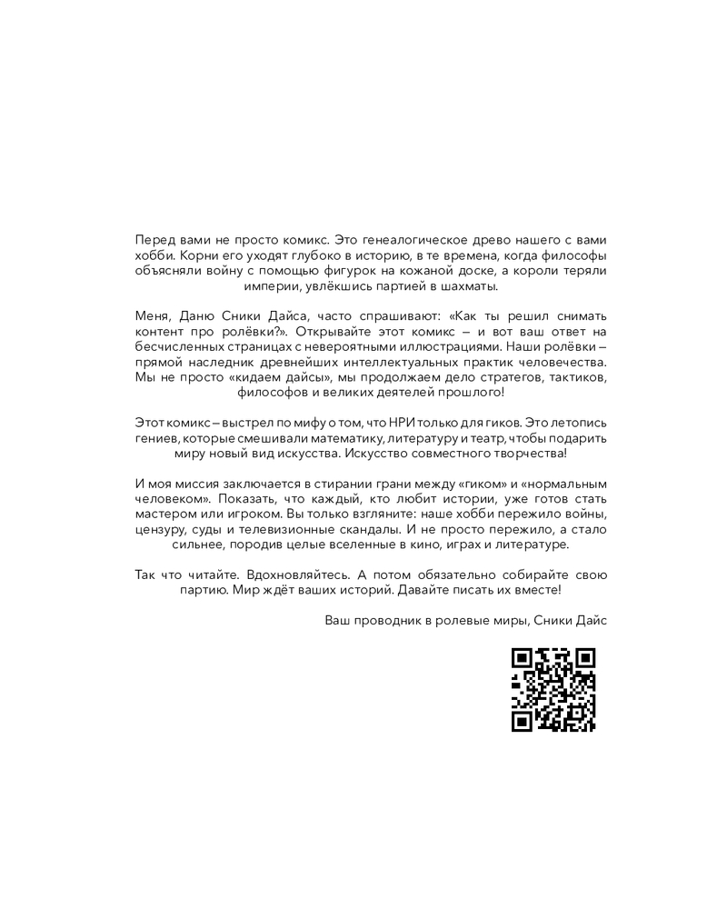 💳 Оплатить за товар можно при получении 🇰🇿 Есть бесплатная доставка по Казахстану от 1 дня 🎁 Копите бонусы с каждой покупки Серия: Кроссовер. Комикс-нон-фикшн Ролевые игры вроде Dungeons & Dragons, в которых игроки влезают в шкуру героев и переживают собственные приключения, окончательно выбрались из гиковского подвала в мейнстрим. Сегодня ими увлекаются знаменитости, по ним выходят хитовые подкасты и проводятся успешные краудфандинговые кампании. История настольных ролевых игр началась ещё в эпоху настоящих воинов, развиваясь и меняясь вплоть до нашего современного, цифрового века. За этот рассказ взялись сценаристы Фред ван Ленте и Том Фаулер («Рик и Морти»). Авторы приглашают нас в увлекательное путешествие по эпохам, показывая не только, как работают НРИ и почему мы их любим, но и что они говорят о нас самих. |
