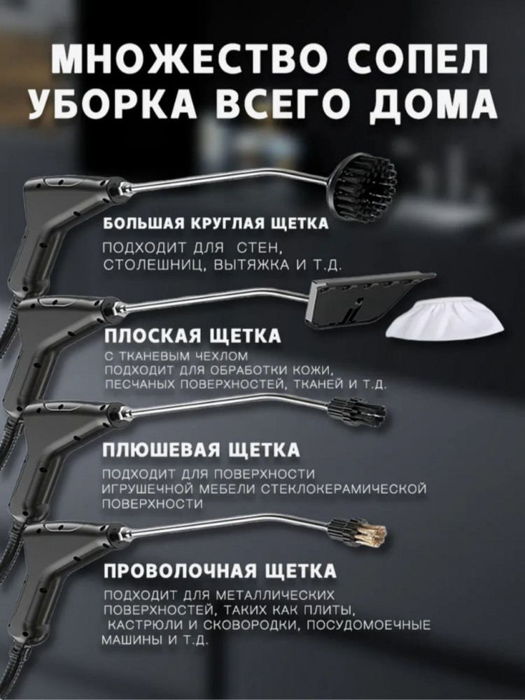 Набор с многофункциональными насадками в комплекте: пластиковая и железная щелевые щетки для самых сложных загрязнений на кафеле, плитке или плите. Широкая щетка используется для удаления шерсти животных и волос с мебели. Универсальная широкая насадка позволит отпарить одежду и помыть окна. С насадками-переходниками доскональная очистка любого предмета и уголка в доме, квартире или на даче — легко и просто.