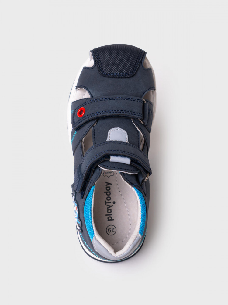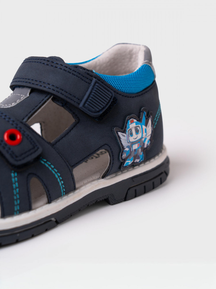 Сандалии для мальчика с закрытой носочной и пяточной частью выполнены из искусственного нубука. Удобный ремень с липучкой позволяют регулировать обувь на любой подъем и позволяют ребенку обуваться самостоятельно. Подкладка выполнена из натуральной свиной кожи. Стелька выполнена из натуральной свиной кожи и имеет анатомический элемент для поддержания свода стопы в правильном положении. Подошва из ТПР гибкая и нескользкая.