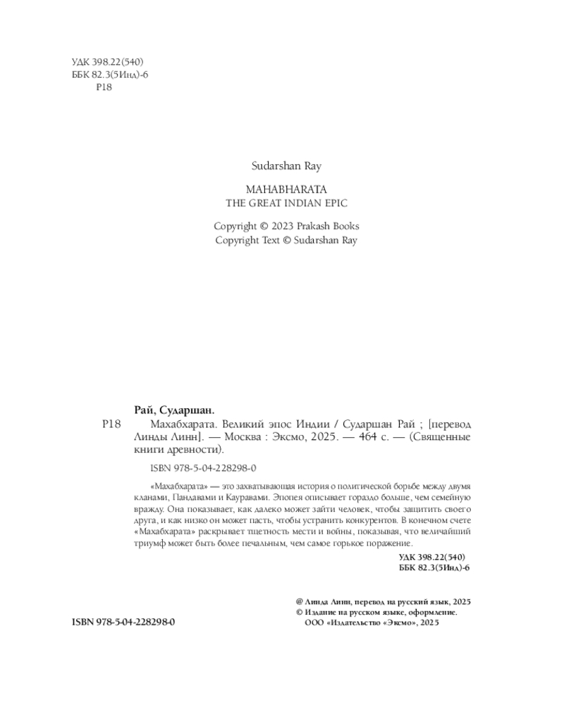 💳 Оплатить за товар можно при получении 🇰🇿 Есть бесплатная доставка по Казахстану от 1 дня 🎁 Копите бонусы с каждой покупки Серия: Священные книги древности «Махабхарата» — это захватывающая история о политической борьбе между двумя кланами, Пандавами и Кауравами. Эпопея описывает гораздо больше, чем семейную вражду. Она показывает, как далеко может зайти человек, чтобы защитить своего друга, и как низко он может пасть, чтобы устранить конкурентов. В конечном счете, «Махабхарата» раскрывает тщетность мести и войны, показывая, что величайший триумф может быть более печальным, чем самое горькое поражение. |