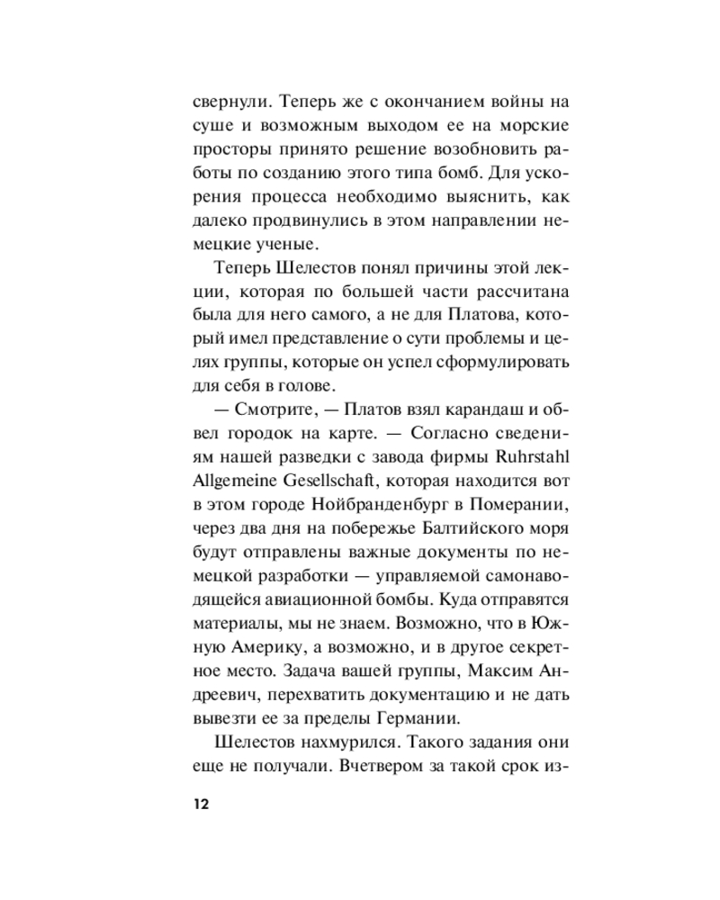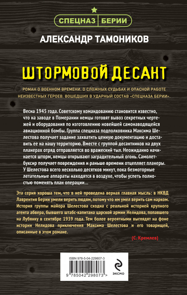 💳 Оплатить за товар можно при получении 🇰🇿 Есть бесплатная доставка по Казахстану от 1 дня 🎁 Копите бонусы с каждой покупки Серия: Спецназ Берии. Герои секретной войны Весна 1945 года. Советскому командованию становится известно, что на заводе в Померании немцы готовят вывоз секретных чертежей и оборудования по изготовлению новейшей самонаводящейся авиационной бомбы. Группа спецназа подполковника Максима Шелестова получает задание захватить ценную документацию и доставить ее на нашу территорию. Вместе с группой десантников на двух планерах отряд отправляется во вражеский тыл. Неожиданно начинается шторм, немцы открывают заградительный огонь. Самолет-буксир получает повреждения и раньше времени отцепляет планеры. У Шелестова всего несколько десятков минут, пока безмоторные летательные аппараты находятся в воздухе, чтобы успеть полностью поменять план операции... |