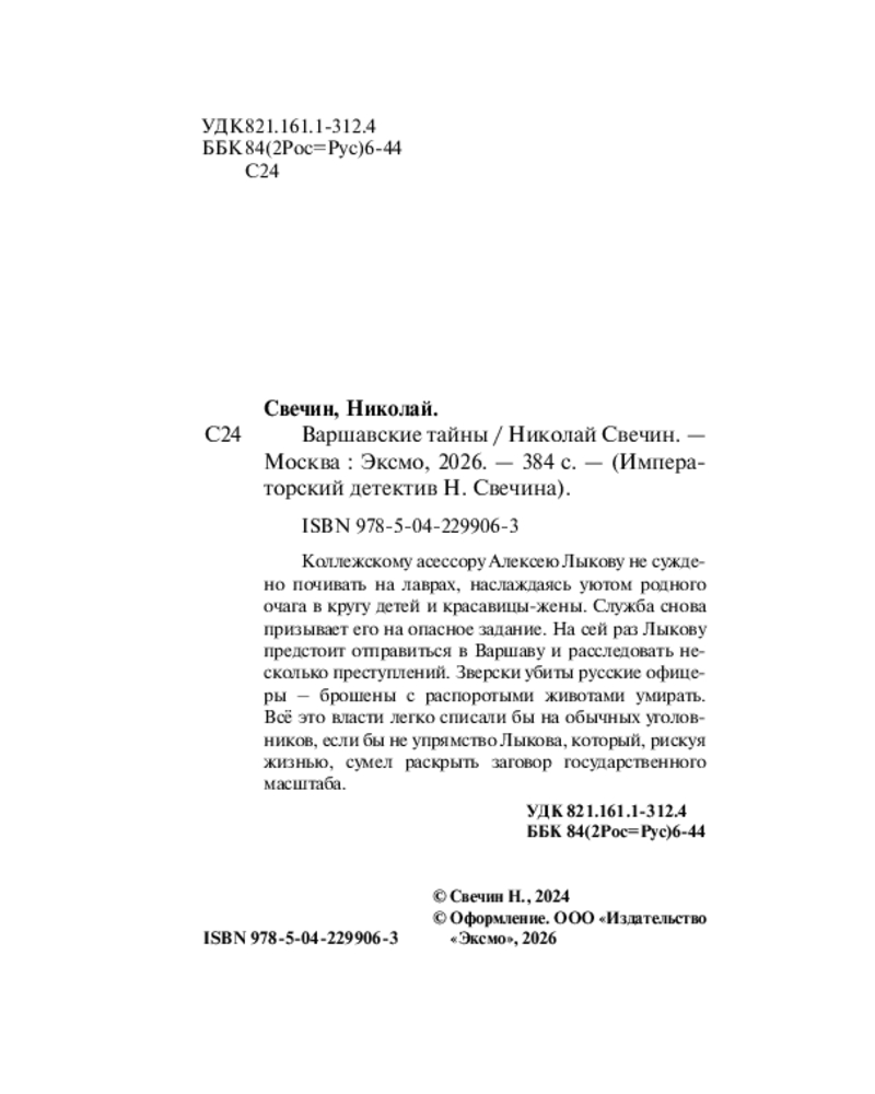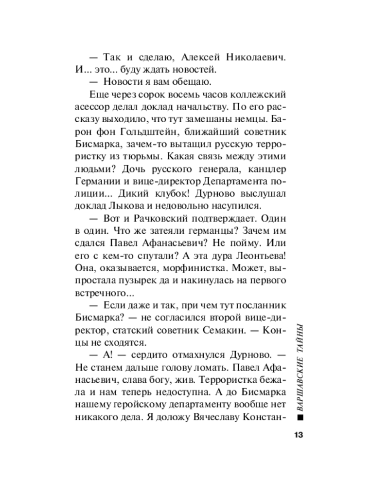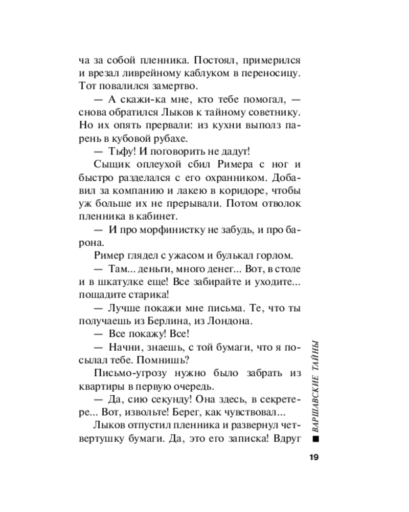 💳 Оплатить за товар можно при получении 🇰🇿 Есть бесплатная доставка по Казахстану от 1 дня 🎁 Копите бонусы с каждой покупки Серия: Императорский детектив Н.Свечина (обложка) Коллежскому асессору Алексею Лыкову не суждено почивать на лаврах, наслаждаясь уютом родного очага в кругу детей и красавицы-жены. Служба снова призывает его на опасное задание. На сей раз Лыкову предстоит отправиться в Варшаву и расследовать несколько преступлений. Зверски убиты русские офицеры — брошены с распоротыми животами умирать. Всё это власти легко списали бы на обычных уголовников, если бы не упрямство Лыкова, который, рискуя жизнью, сумел раскрыть заговор государственного масштаба. |
