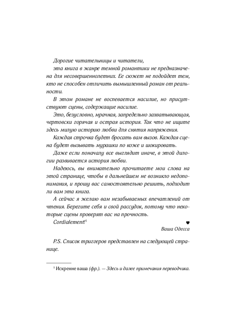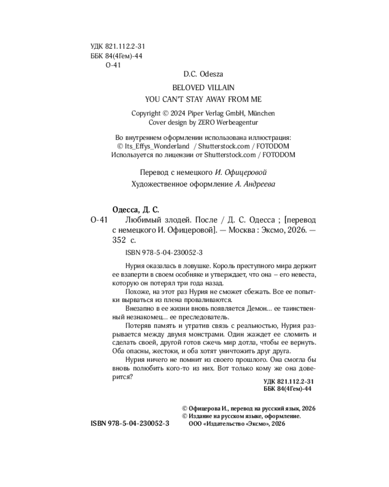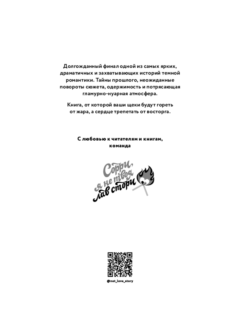💳 Оплатить за товар можно при получении 🇰🇿 Есть бесплатная доставка по Казахстану от 1 дня 🎁 Копите бонусы с каждой покупки Серия: New Adult. Возлюбленный злодей Он — ее любимый злодей. Она — его единственная слабость. Нурия оказалась в ловушке. Король преступного мира держит ее взаперти в своем особняке и утверждает, что она — его невеста, которую он потерял три года назад. Похоже, на этот раз Нурия не сможет сбежать. Все ее попытки вырваться из плена проваливаются. Внезапно в ее жизни вновь появляется Демон... ее таинственный незнакомец... ее преследователь. |