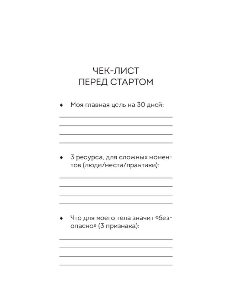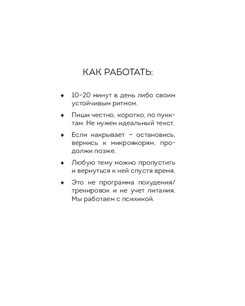 💳 Оплатить за товар можно при получении 🇰🇿 Есть бесплатная доставка по Казахстану от 1 дня 🎁 Копите бонусы с каждой покупки Серия: Экспресс-терапия. Дневники для работы над собой без сложных слов и долгих сессий Тело — не проект. Это твой партнер. А этот дневник — не про сантиметры, калории и «стандарты красоты». Он про союз с собой: слышать сигналы тела, уважать его границы, снижать стыд и внутреннюю критику, находить формы заботы, которые действительно поддерживают. Это 30 шагов от чужих голосов о твоем теле — к собственному голосу, который добрый, внимательный и уважительный. |