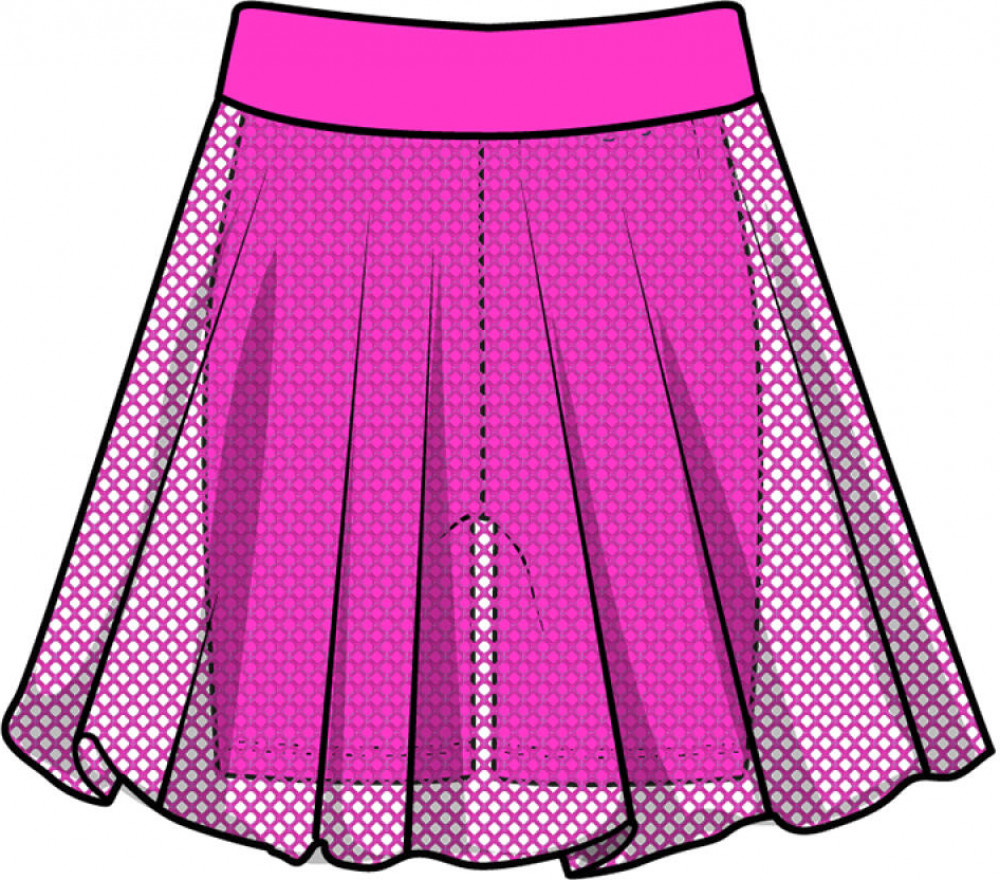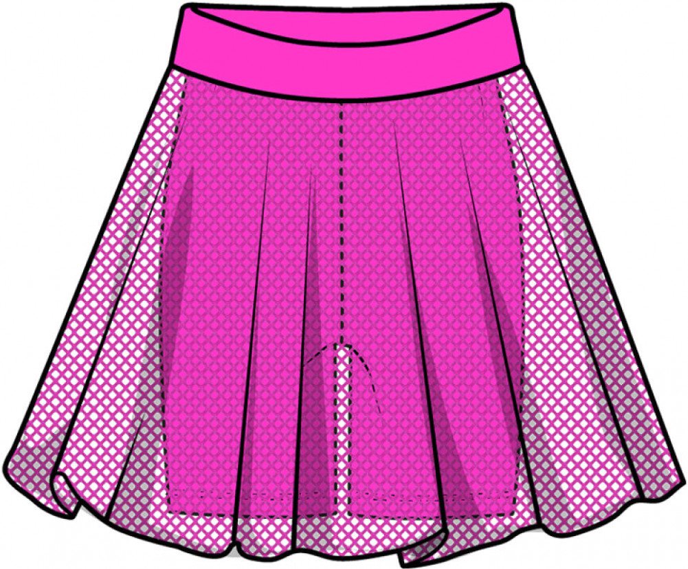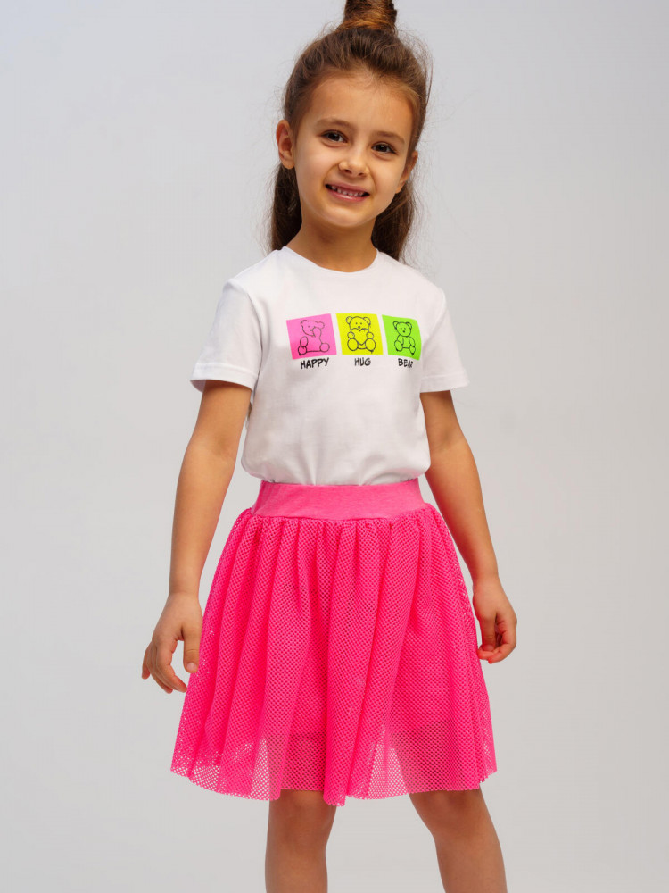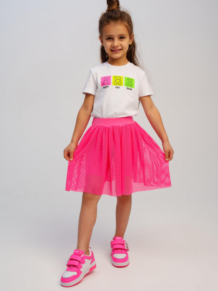 Детская юбка-легинсы для девочки. Верхняя часть выполнена из легкой сетчатой ткани, под ней — плотные трикотажные укороченные легинсы. Широкий пояс держится за счёт внутренней резинки. Длина юбки — до середины бедра.