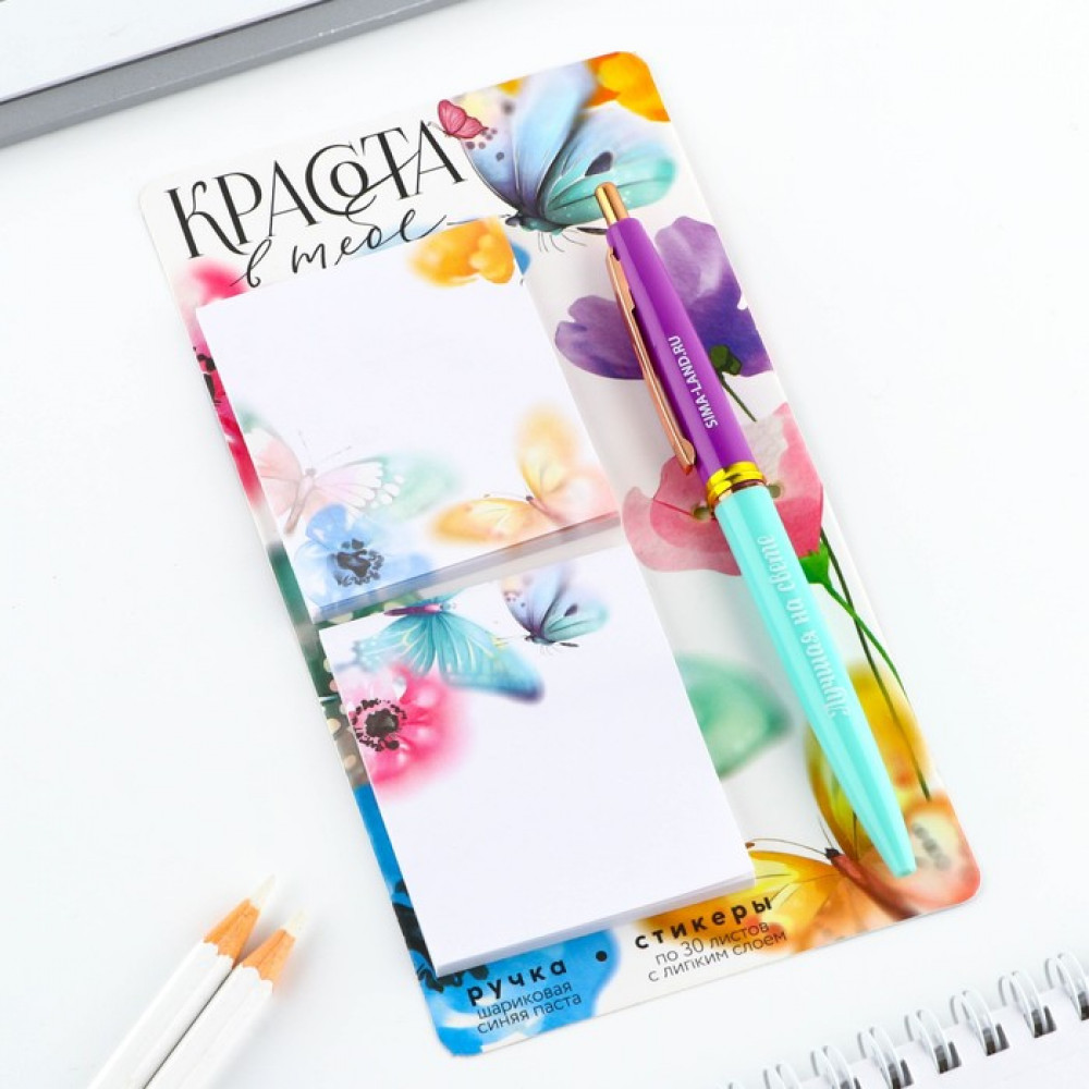 Элегантный подарочный набор «Красота в тебе» — это гармоничное сочетание практичности и эстетики. В комплект входят яркие стикеры (2 блока по 30 листов) и удобная шариковая ручка с синей пастой толщиной письма 0.7 мм — всё, что нужно для заметок, планирования и творческих идей.