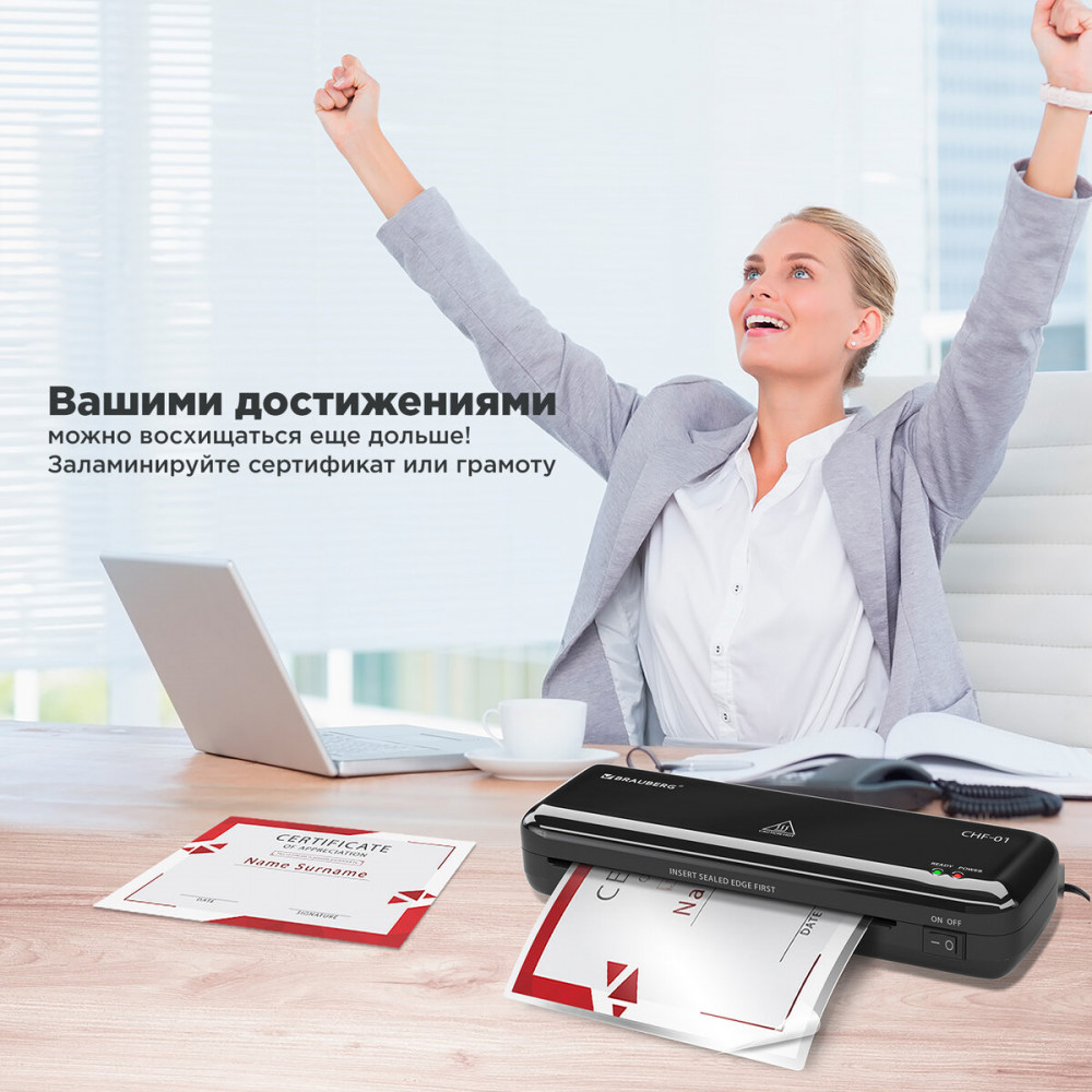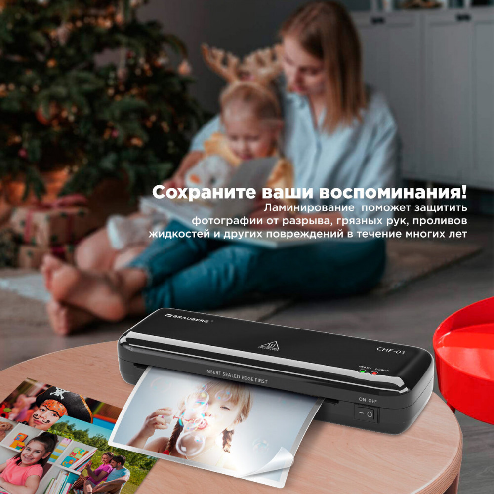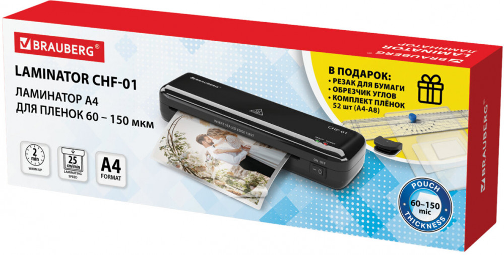 Ламинатор BRAUBERG CHF-01 отлично подойдет для работы дома и в офисе. Предназначен для ламинирования документов, меню, рисунков, фотографий. В подарок к нему вы получите стартовый набор для ламинирования: резак, обрезчик углов и 52 пленки форматов А4-А8.