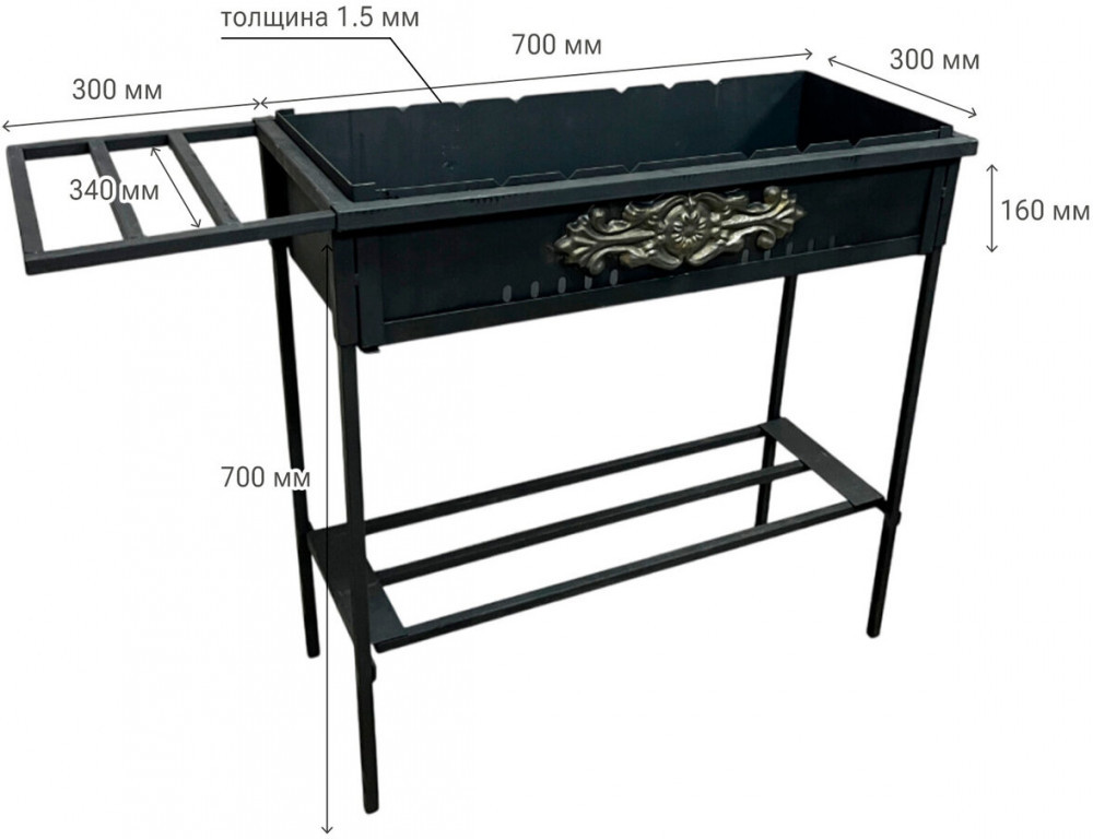 Мангал хорошо накапливает и удерживает тепло, имеет долгий срок службы — всё благодаря металлу толщиной 1,5 мм и усиленным по периметру стенкам топки.