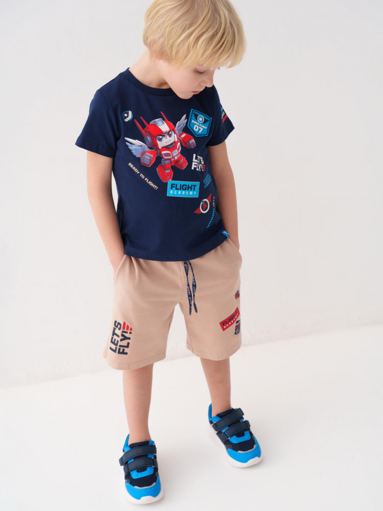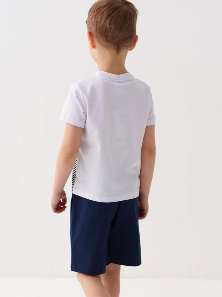 Набор детских шорт для мальчика. В комплект входят две пары шорт свободного кроя, ниже колена. Модели из мягкого, хлопкового трикотажа джерси. Удобная посадка обеспечивается эластичным поясом со шнуром. По бокам расположены два кармана.