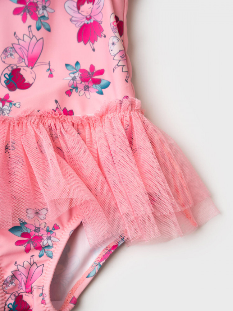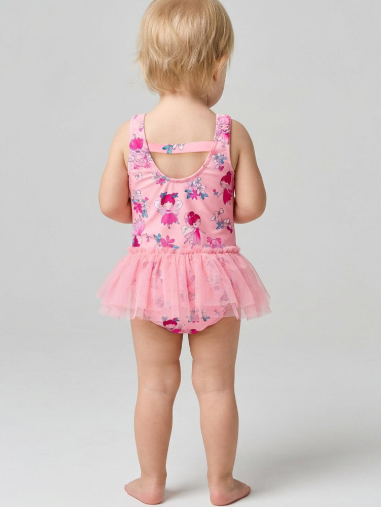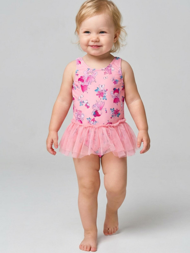 Детский слитный купальник для девочки. Выполнен в розовом цвете с ярким принтом с феями и цветами. Модель с открытой спинкой и декоративными резинками. По талии пришита пышная юбочка из воздушной сетки. Внутри подкладка. Все края обработаны эластичной тесьмой, чтобы изделие хорошо сидело на теле и не натирало. Благодаря UF-защите, ткань сохраняет первоначальный вид даже при длительном пребывании на солнце. Подходит для плавания и активного отдыха.